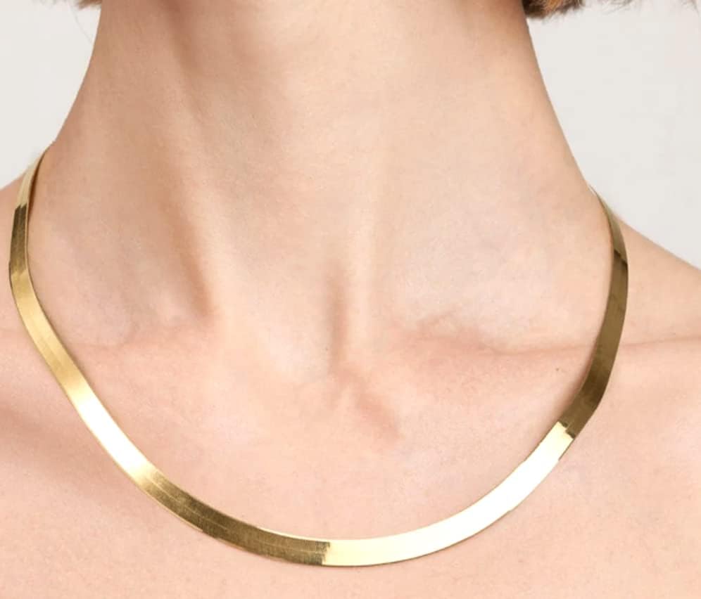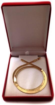 • This herringbone style chain necklace is good for wearing it alone or with pendants. The necklace has a high polished finish that give the necklace a yellow shiny golden look. The necklace will not change any colors and will be fine when wearing it on water.