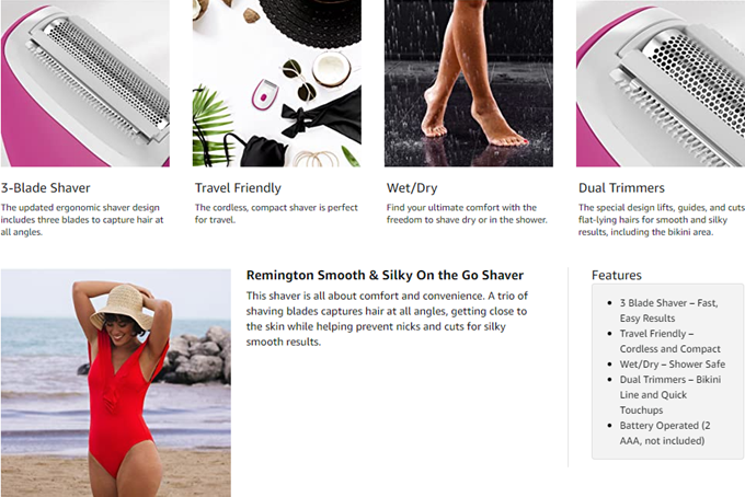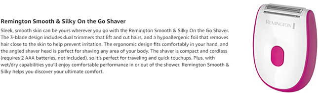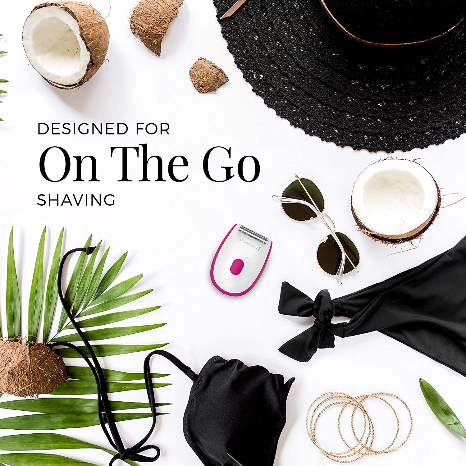 Color:Pink The remington ready shave go wet/dry shaver is a compact battery operated shaver is easy to use wherever, whenever; with a full size foil and dual trimmers youll enjoy quick and easy shaving with fewer missed hairs and smooth results even on the bikini line. the angled head helps give you a faster shave and the ergonomic design adds ease and comfort to your routine.