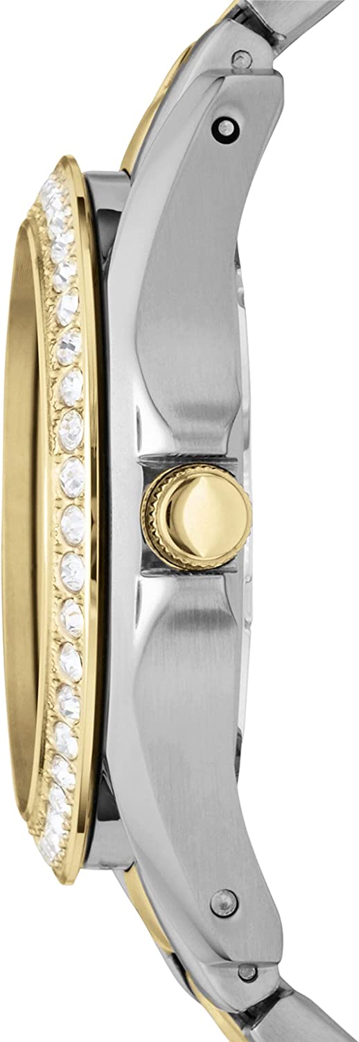 • Two-tone stainless steel case with silver dial; silver and gold-tone stainless steel bracelet band; links can be removed for a customized fit