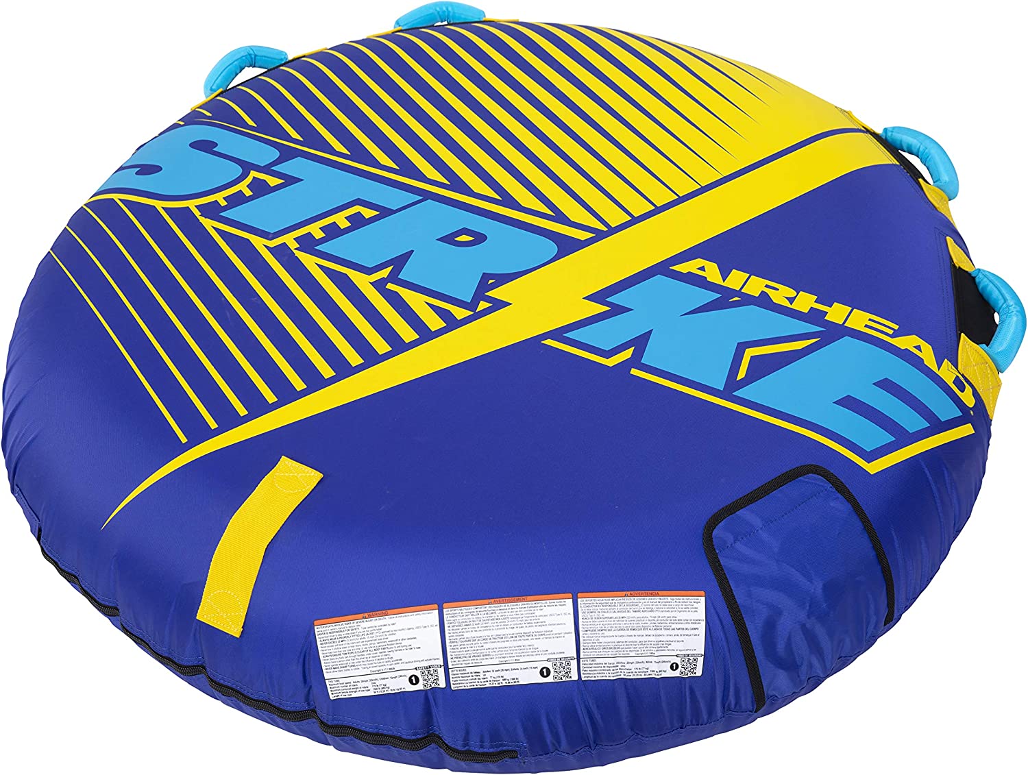 AIRHEAD STRIKE is an incredible value for a fully covered deck tube! It's a 1 rider 54 in. (deflated) round towable with 4 nylon wrapped handles and neoprene knuckle guards. The RF welded PVC bladder is fully encased by a durable double-stitched nylon cover. STRIKE is equipped with a Speed Safety valve for easy inflation and deflation, covered flap for safety.