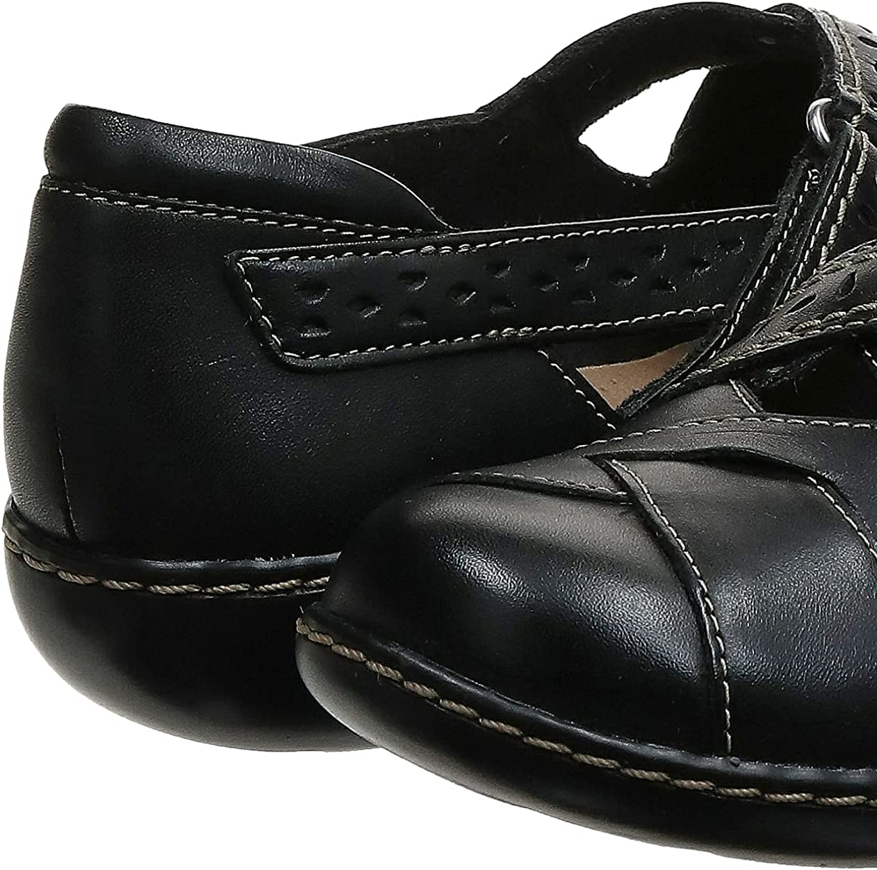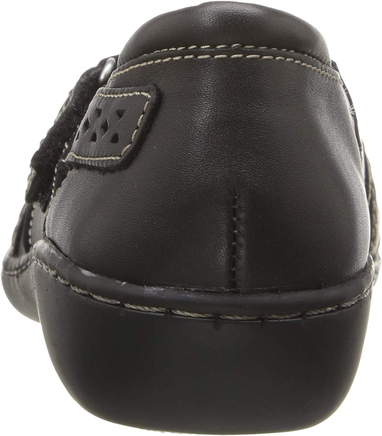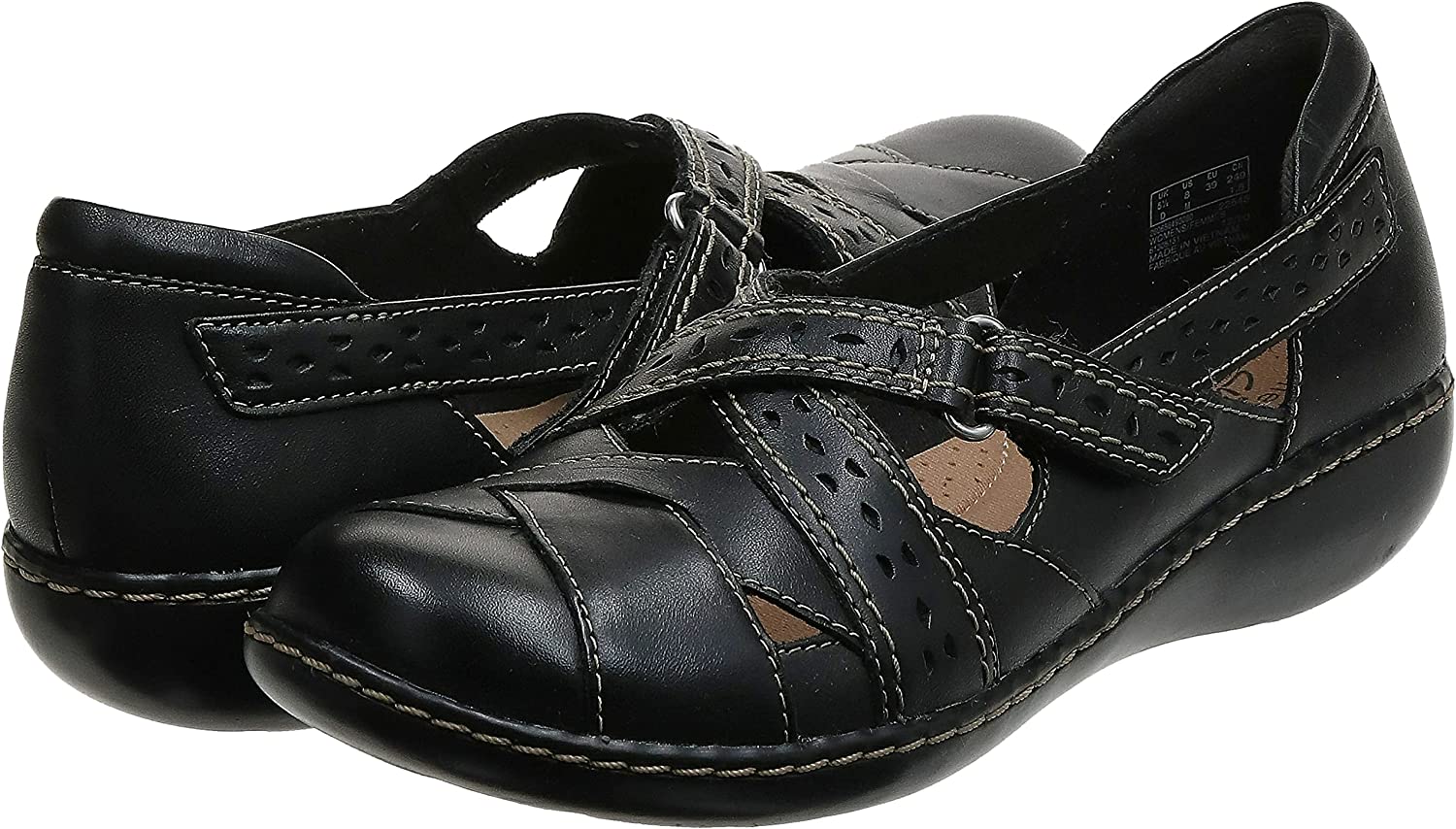 Beautifully constructed in soft leather with a low wedge for walking ease, this clarks collection shoe goes way beyond basic. an adjustable hook-and-loop strap, fabric linings, and super flexible, lightweight tpr outsoles cushion the foot in comfort.