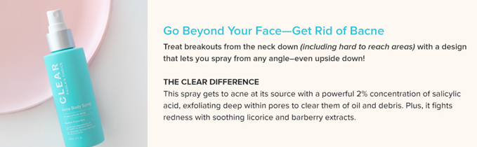 Paula's Choice CLEAR Back & Body Acne Spray is formulated to be incredibly effective in the treatment of body acne (like back acne). 2% Salicylic acid (BHA) penetrates pores to eliminate bumps, pimples, and blackheads without the damaging effects of rough body scrubs or brushes. It is even suitable for skin prone to cystic acne.