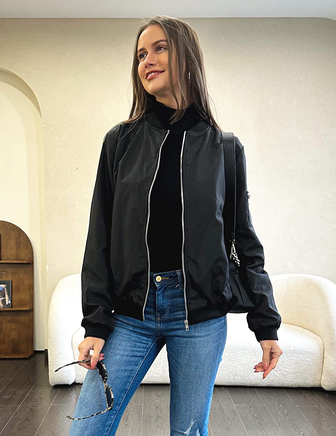 [Match]: This classic bomber jacket is perfect for a casual look with a basic tee and jeans. Suitable for matching clothes all year round