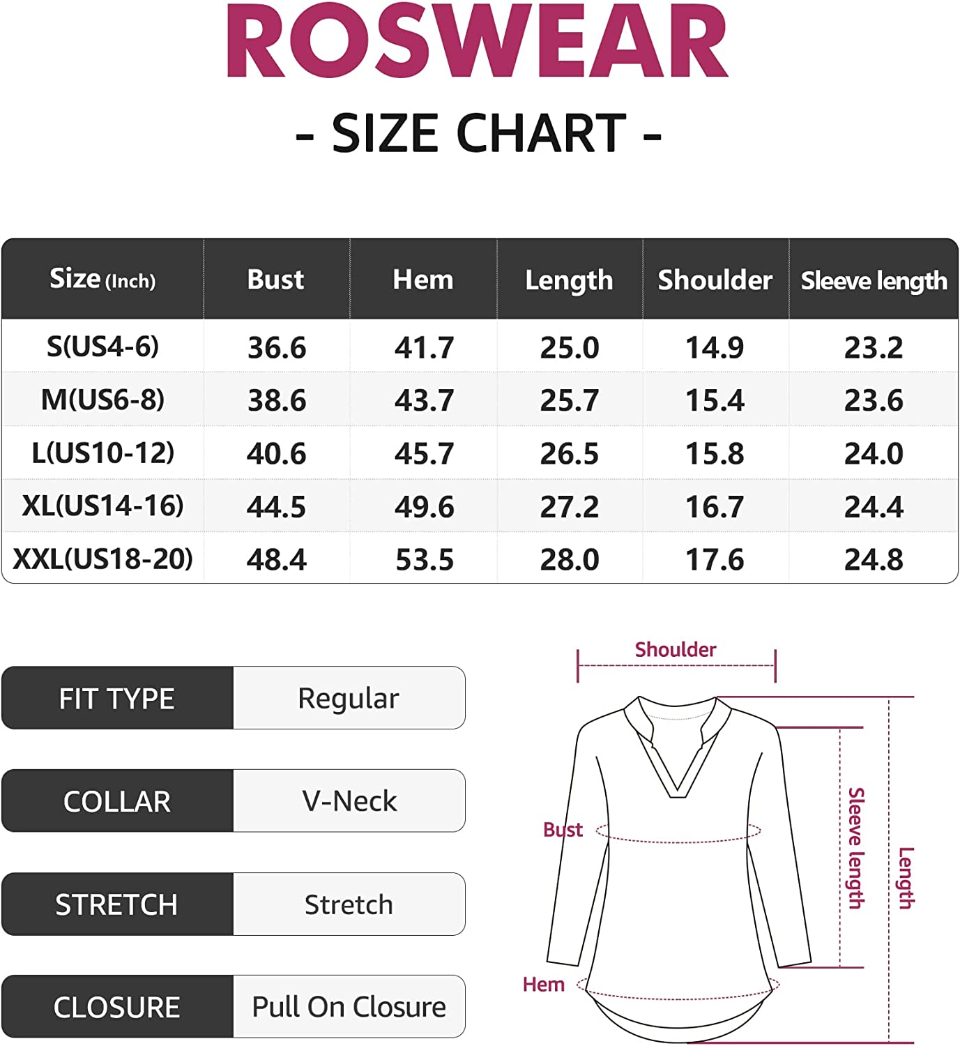 roswear Women's Business Casual V Neck Cuffed Sleeves Work Blouse Top
