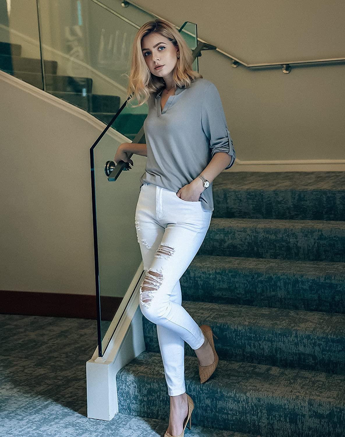 This blouses features 3/4 cuffed sleeve give us a cool and fresh style, which is easy to roll up and buttons stylishly