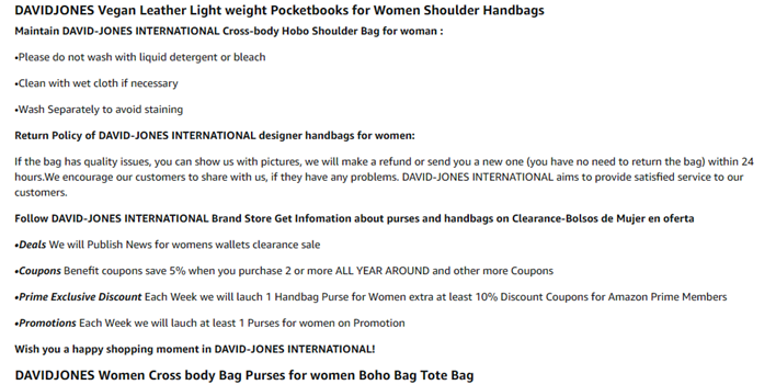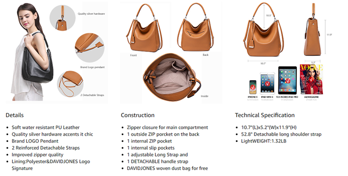 • DAVIDJONES:a brand comes from Paris since 1987.Selling Handbags for Women and Girls in More than 100 countries.Great stylish and Convertible Womens Purses.Excellent craftsmanship and refined premium quality leather like PU bags.Decent high end women handbags with affordable price.