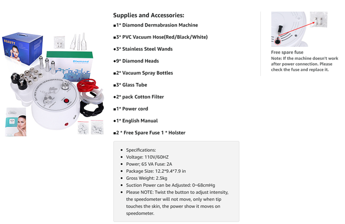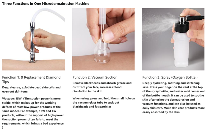 - ?【3 in 1 BEAUTY INSTRUMENT:】Besides the Diamond Microdermabrasion, this machine also has Vacuum function, and Spray function. 3 GLASS VENTOUSE FOR VACUUM SUCTION and 2 SPECIAL BOTTLES FOR SPRAY