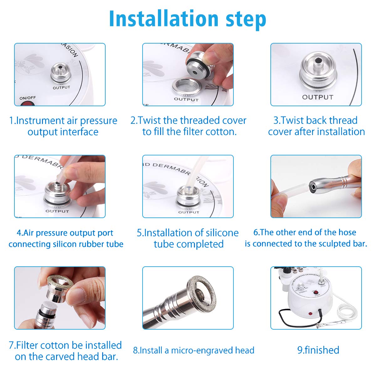 - ?【9 Diamond Head】The microdermabrasion machine is equipped with 9 shaped diamond head of different functions,it has adjustable vacuum intensity to adapt to different area treatment. It suits for face, forehead, chest, nose, neck, near eye area, and detachable bracket for convenient arrangement of diamond heads and wands. ★★Notice: Please start from the lowerest setting, then enhance vacuum bit by bit