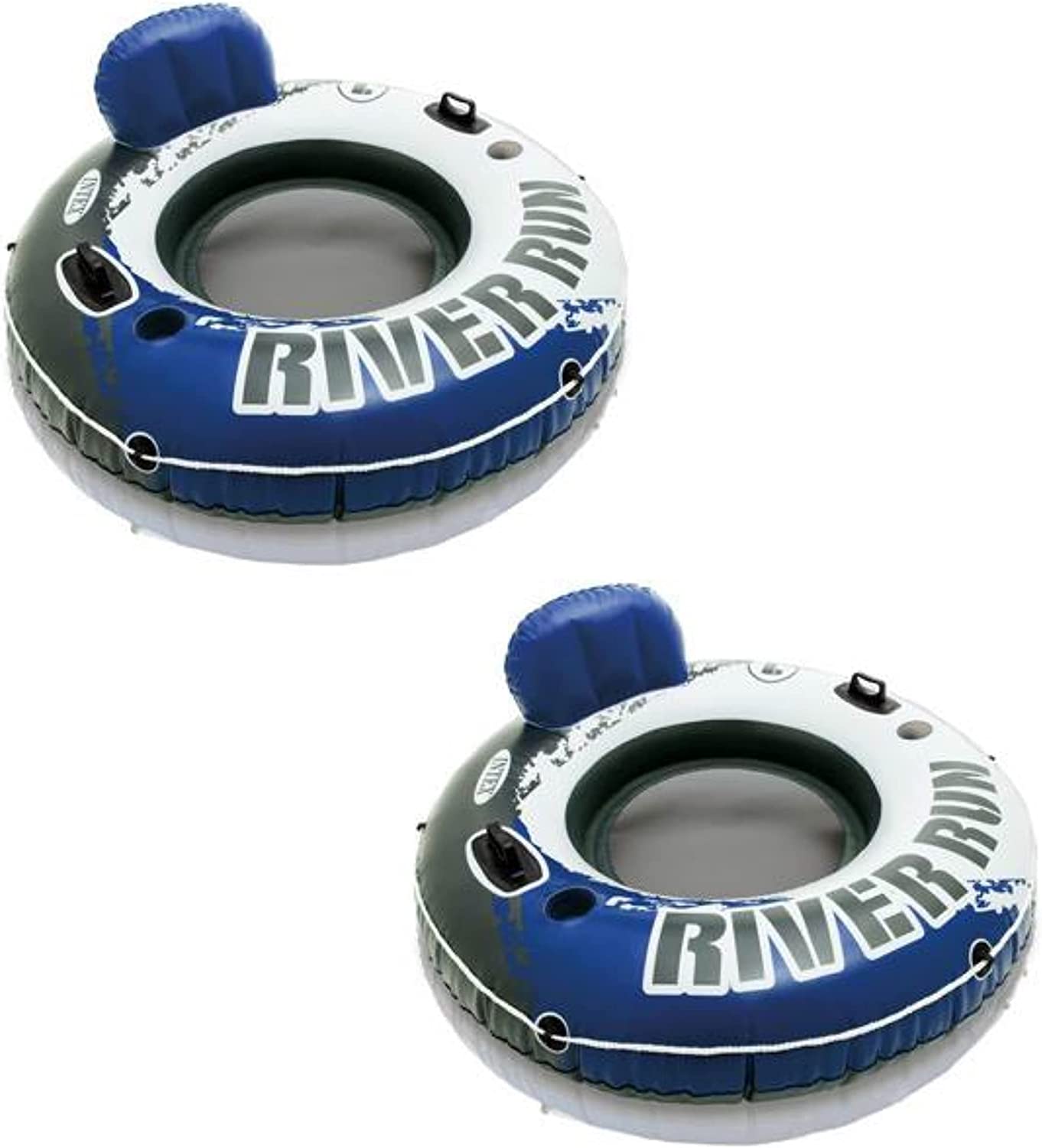 Intex River Run II Inflatable Double Rider Inntertube with Built-in Cooler and Cupholders with River Run I Single Floating Water Rafts (2 Pack)