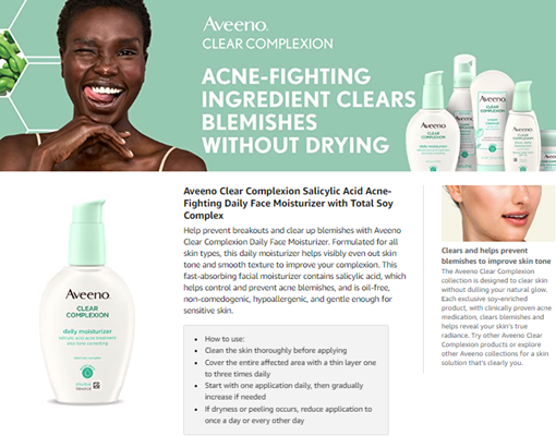 • The Aveeno Clear Complexion collection is designed to clear skin without dulling your natural glow. Each exclusive soy-enriched skincare product, with clinically proven acne medication, clears blemishes and helps reveal your skin's true radiance