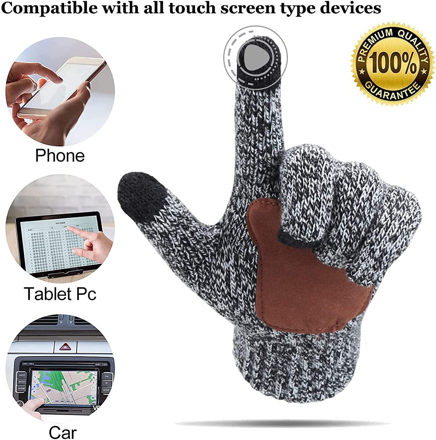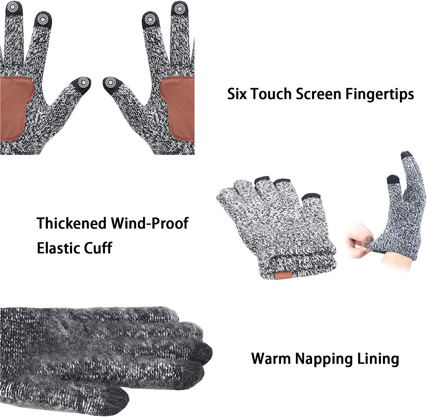 • Touch Screen Knit Gloves - Equipped with upgraded touch screen conductive fabric on the thumbs, index fingers and middle fingers; You can use the smartphones, iPads, car touchscreen and other touchscreen devices normally without taking the gloves off.