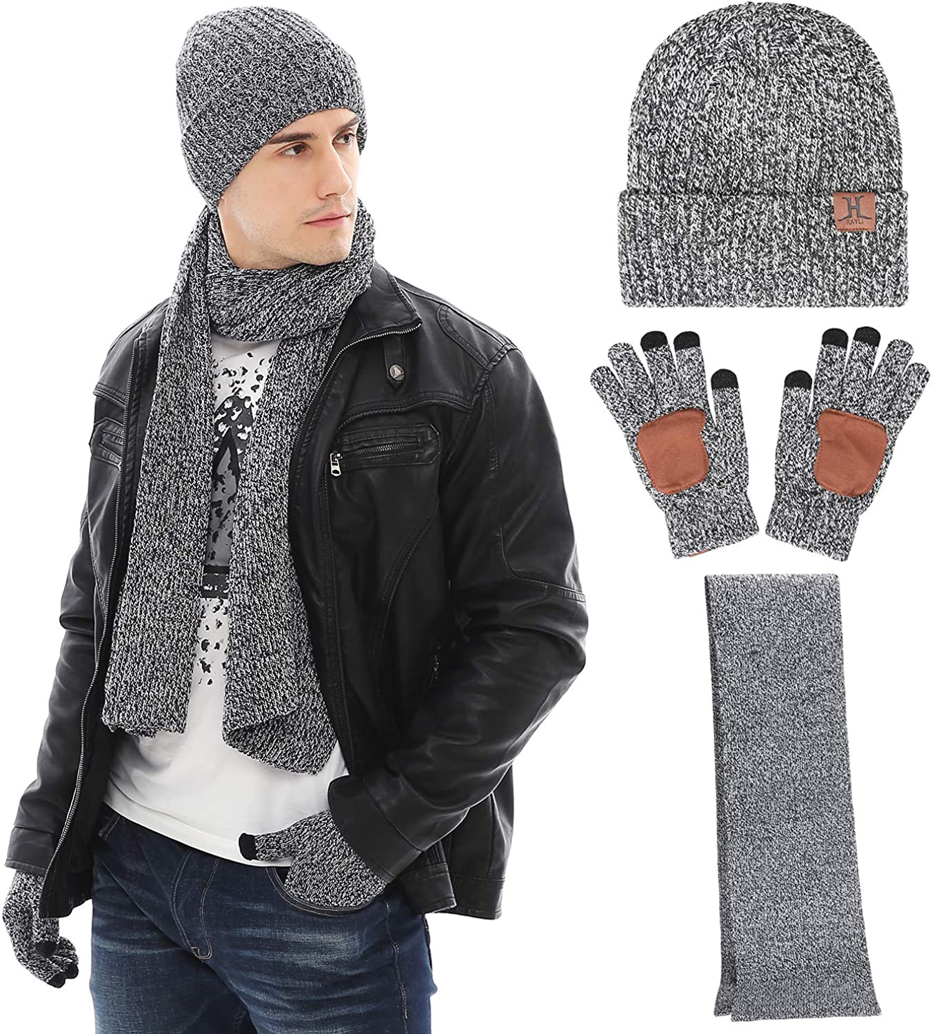 Men & Women Winter Knit Hat Beanie Long Scarf Touchscreen Gloves Set Skull Cap Neck Warmer Gloves Set with Fleece Lined