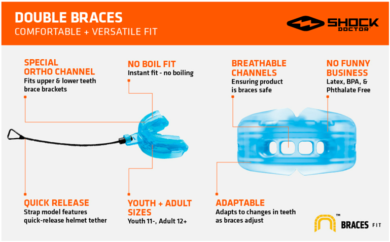 • FOR BRACES: Specifically developed for use with orthodontics – ergonomically designed to sit on top of the brackets and keep upper and lower teeth protected out on the field.