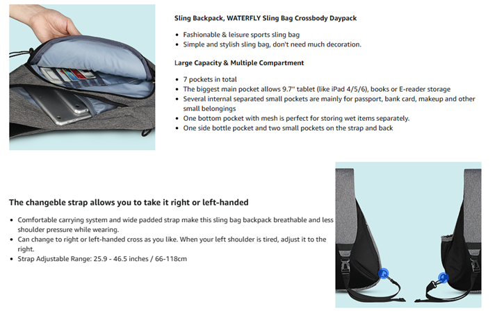 WATERFLY Sling Bag Crossbody Backpack: Over Shoulder Daypack Casual Cross Chest Side Pack