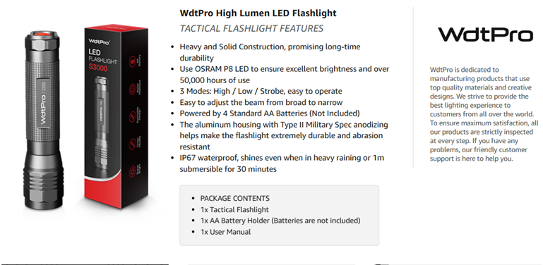 • 【BRIGHTEST FLASHLIGHT】 With high power OSRAM P8 LED, the S3000 provides up to 1600 real lumens(Max) but only need 4 * AA batteries (battery not included). This mid-size flashlight is high on power but still compact enough to fit in your hands, backpack, survival kit, or glove compartment.