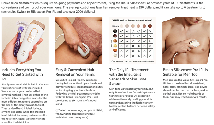 Silk·expert Pro is Braun’s latest generation IPL. Silk·expert Pro 5 is the safest, fastest and most efficient IPL* for long-lasting hair reduction in just 4 weeks*. The safest IPL technology, clinically tested and dermatologically accredited as skin safe by an international skin health organization (Skin Health Alliance). It automatically and continuously adapts to your skin tone to ensure optimal balance between efficacy and safety† for visible long-lasting hair removal. The fastest IPL, it’s 2 times faster than previous Silk·expert 5: both lower legs can be treated in less than 5 minutes. It includes a precision head to tackle the smaller areas such as the face, bikini line or underarms. New compact design, 15% smaller and 25% lighter, for easy handling and effortless treatment. 400,000 flashes, 30% more than previous Silk·expert 5. Assessed on lower leg, armpits & bikini, following the treatment schedule. Individual results may vary. †Shared technology with Cyden. For more information, visit Braun.com website