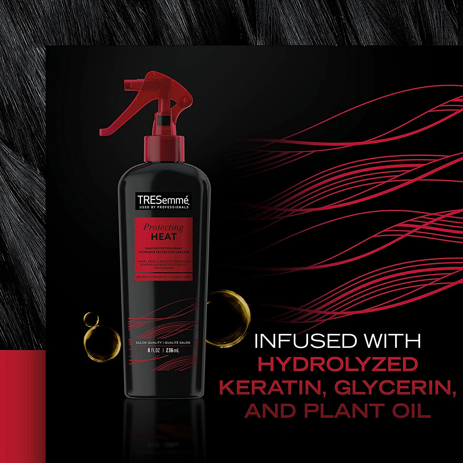 Most of us are guilty of going straight for our heat styling tools, but eventually, that heat causes split ends and dry hair. So, before you heat style, you need a hair protectant spray to prep and protect your locks. Use TRESemmé Protecting Heat Spray for a finished look that's shiny and undeniably soft. Would you ever grab a hot pan without oven mitts? No. And when heat appliances like flat iron spray and curling irons can reach up to 450°F, you should never use them on your hair without a heat protectant spray for hair either. Our TRESemme Heat Protection is a hair heat protectant designed to enhance hair's flexibility to re-form and hold its shape without getting damaged for ultimate hair heat protection. It's perfect hair protection from heat for those of us who love to style but need to restore vibrancy and shine to dried-out, damaged hair. How to use: Spray this heat protection spray on your hair liberally 6-8 inches away, from mid-shaft to ends, on both damp hair before you blow-dry and dry hair before curling or flat ironing. TRESemmé is an industry leader in providing you with salon-ready hair quality products.