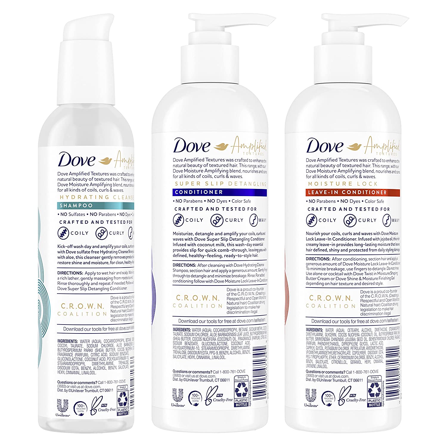 The Dove Amplified Textures system is designed to give intensive moisture amplification to coiled, curly or wavy hair. Created just for textured hair, Dove's thoughtful blend of natural ingredients delivers maximum moisture and leaves hair feeling clean, healthy and full of body and bounce. To create its moisture amplifying blend, Dove uses shea butter, glycerin and Dove's patented Fiber Actives to deliver serious moisture, and nourish and repair your curly or textured hair. You can use the hair care system every time you wash your hair to help give you hydrated, defined, easy to style curls, coils and waves. Start with the Hydrating Cleanse shampoo, working it into hair from scalp to ends and massaging through hair and scalp before rinsing. Next apply the Super Slip Detangling conditioner to the hair, working the product into the hair in sections, from ends to roots to ensure best results. Apply the Moisture Lock Leave-In Conditioner to wet or damp hair and follow with your usual styling products and tools. It is designed to help lock in moisture and protect hair against heated styling tools. Dove believes beauty is about looking and feeling your best. That's why this system uses natural ingredients to nourish and hydrate your textured hair — so that its natural beauty can shine. For best results, use the full Dove Amplified Texture line featuring our Moisture Spa Recovery Mask, Twist in Moisture Shaping Butter Cream ​and Shine & Moisture Finishing Gel.