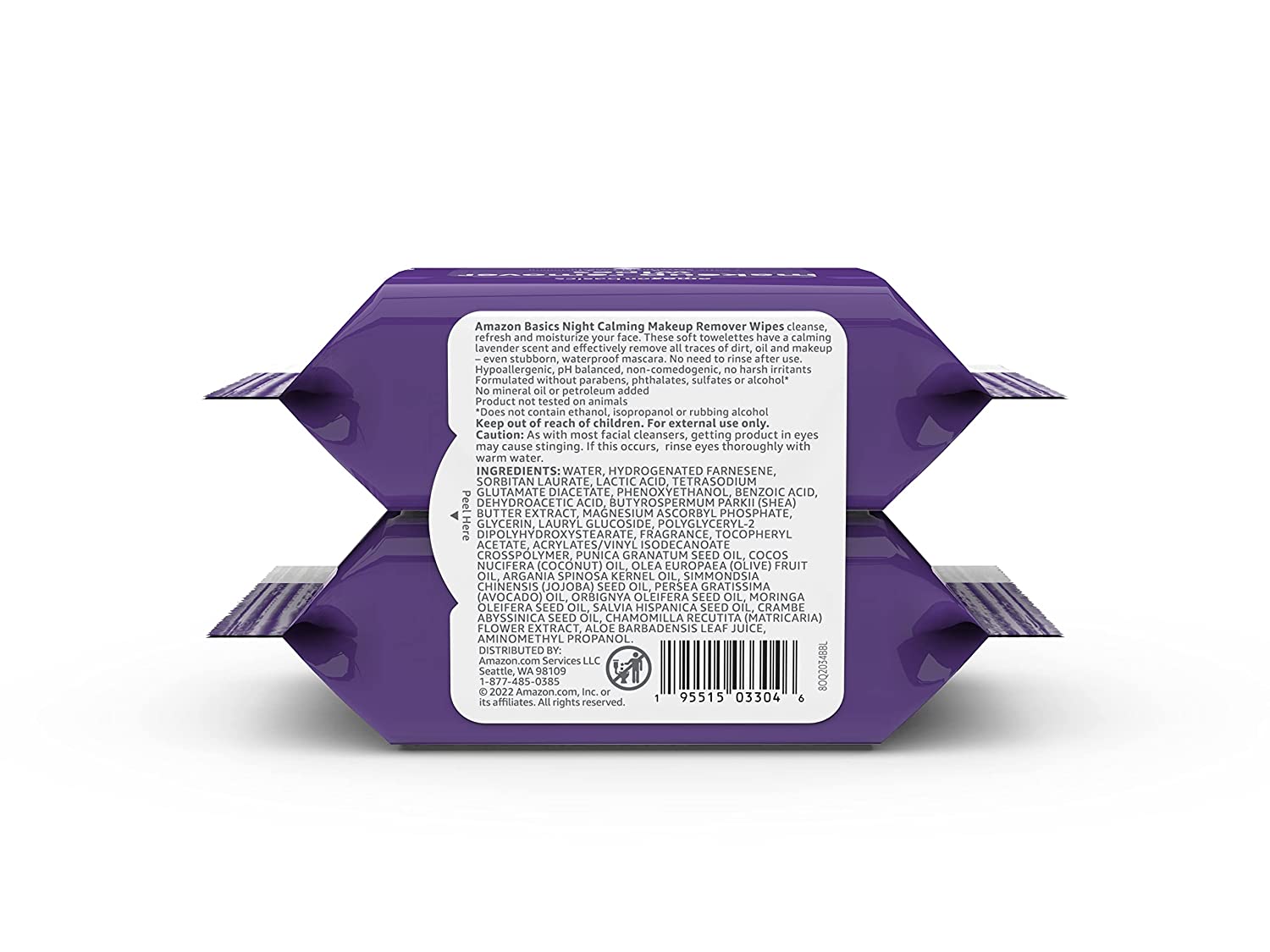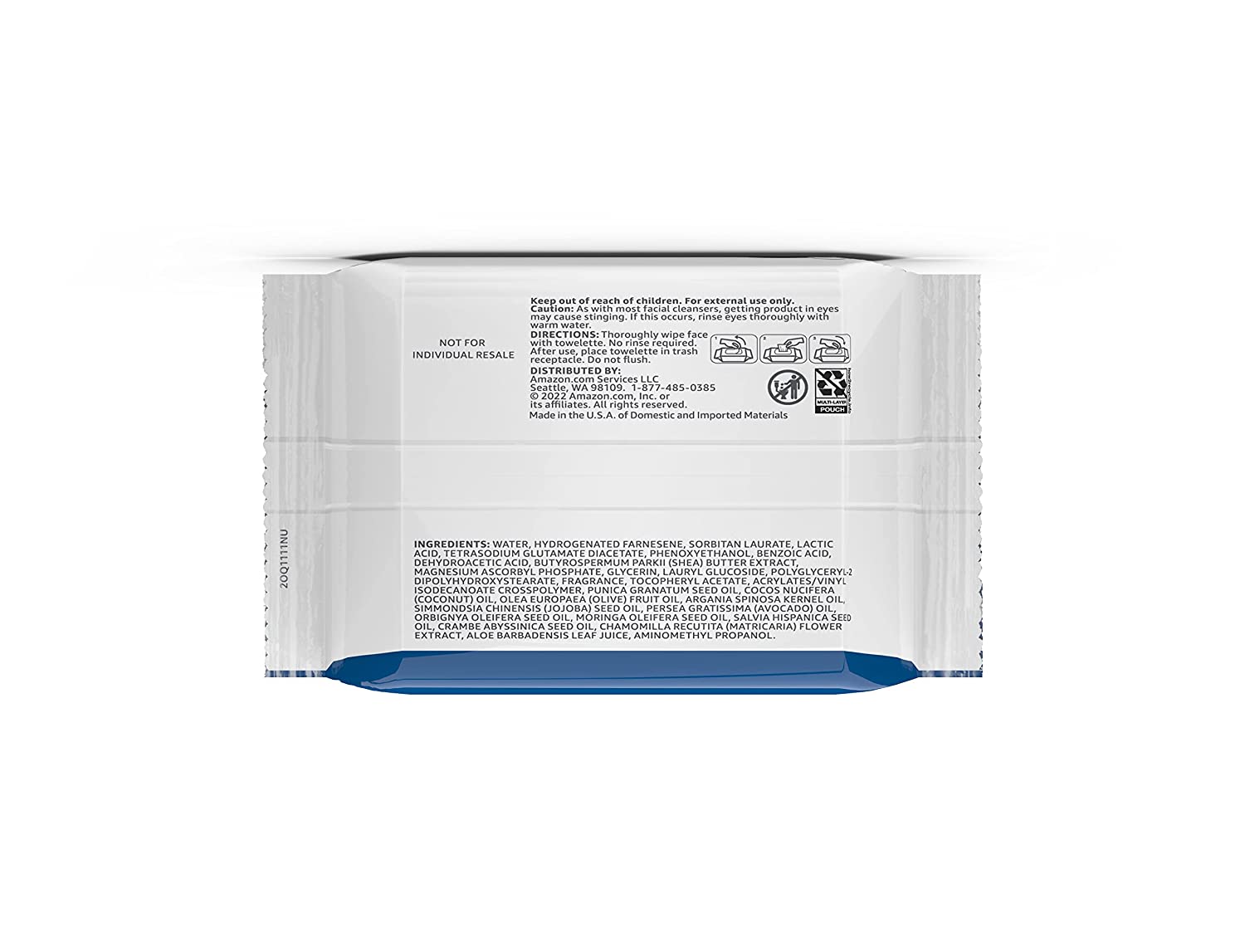 • Six resealable 25-count packs of Amazon Basics Makeup Remover Wipes that cleanse, refresh and moisturize your face