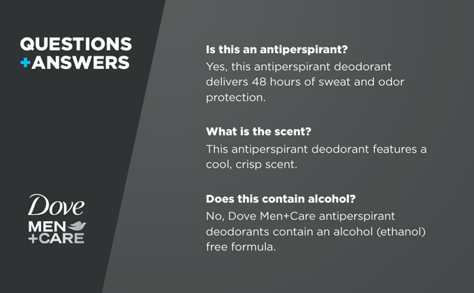 Looking for an antiperspirant for men that’s designed to keep you feeling fresh and confident? Try Dove Men+Care Clean Comfort Antiperspirant Deodorant Stick. Our Clean Comfort antiperspirant deodorant provides powerful 72-hour protection against sweat and odor while caring for your skin. This antiperspirant for men is formulated with 1/4 Moisturizing Cream to deliver skin moisturization and help protect against skin irritation. Discover Dove Men+Care Clean Comfort Antiperspirant Deodorant’s long lasting subtle fragrance to refresh your senses and leave you feeling fresh all day. Simply apply Dove Men+Care Clean Comfort Antiperspirant Deodorant in an even layer onto each of your underarms for best results. You now have the powerful protection you need to stay fresh and feel confident all day. Dove care goes further than moisturizing protection with PETA Cruelty-Free certification and recyclable plastic packs. Looking for more Dove Men+Care skin care products? Try the full range of Dove Men+Care products, including deodorants, antiperspirants, dry spray antiperspirant deodorants, body washes, face and body bars, and hair care products.