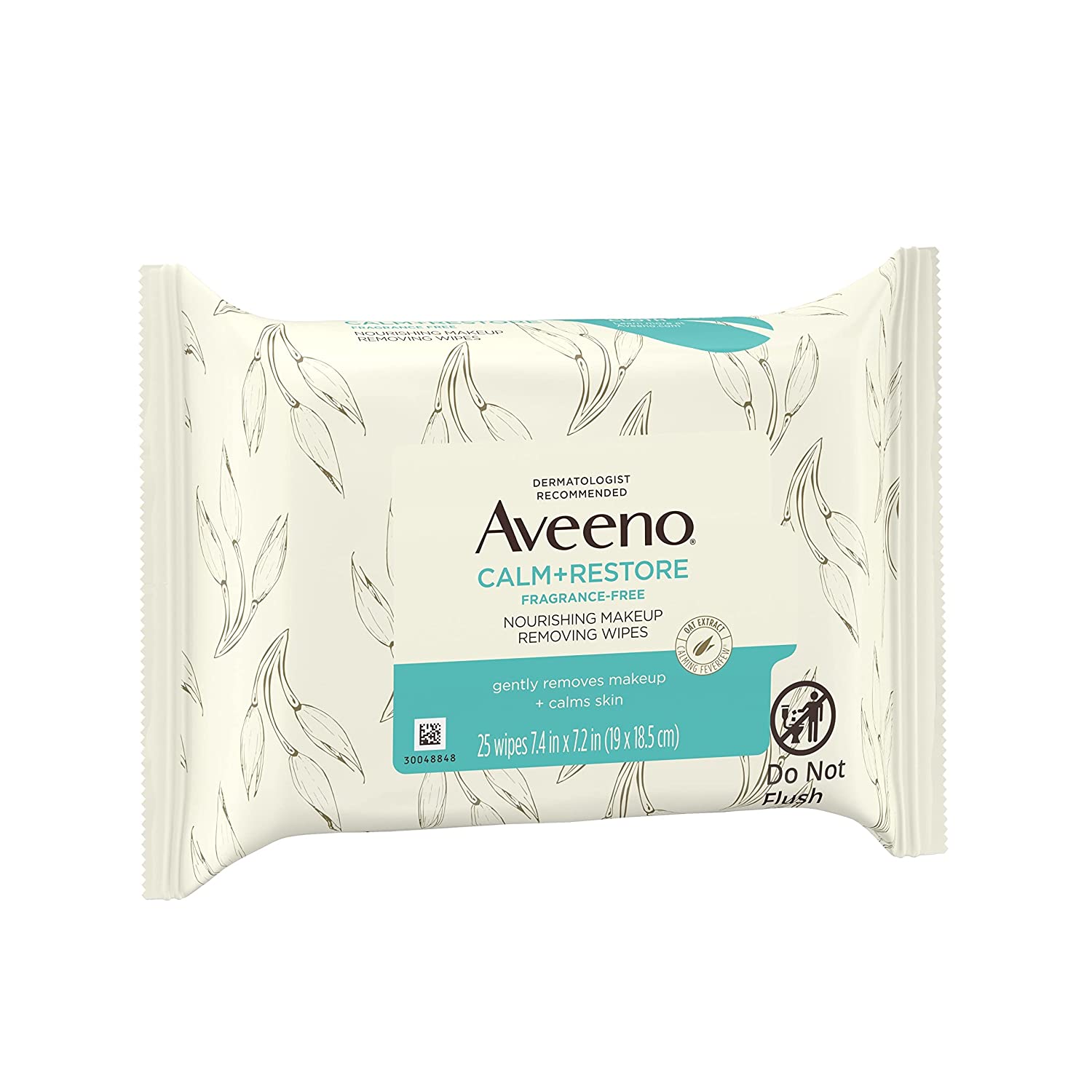 25-count pack of Aveeno Calm + Restore Nourishing Makeup Remover Facial Wipes with oat extract and calming feverfew to nourish skin and remove dirt, oil and makeup in one easy step