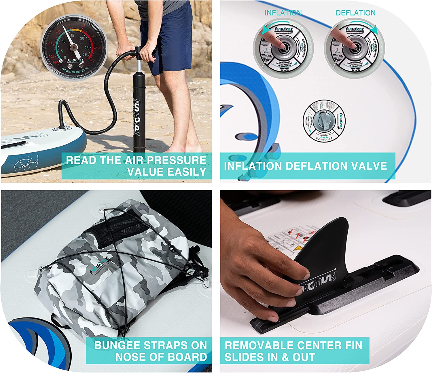 - 【Design and Use】Funwater's unique ergonomic handle design allows you to inflate your paddle more easily in a shorter time. The sensitive barometer ensures that you can read the sup inflation pressure value (12-15psi) at any time. The multifunctional elastic string can tightly fix any objects placed on the inflatable paddleboard. The multipurpose and ultra-large backpack can help you easily carry the paddle to any of your dream places.