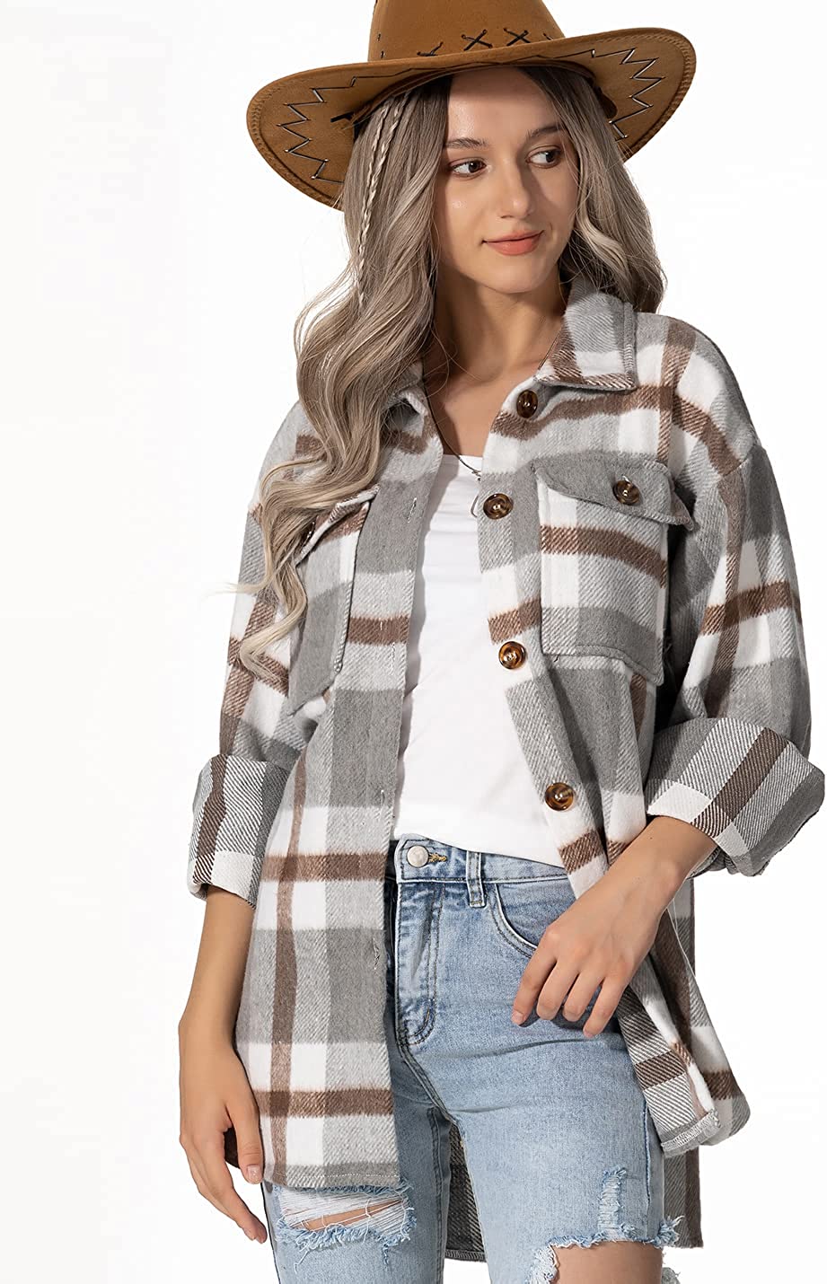 • Feature: fall winter wool blend plaid shirt jacket, casual winter jacket for women, lapel collar turn-down collar long sleeve oversized flannel shackets jacket with front button placket, color block contrast plaid print button down shirts for women lady girls