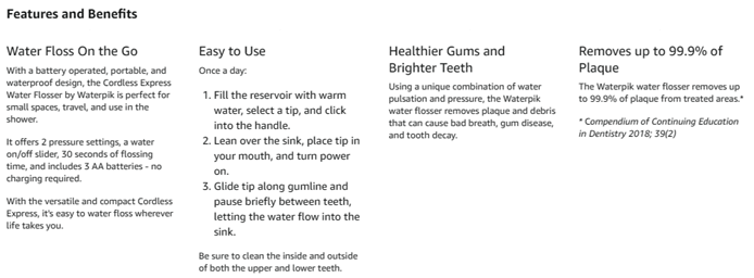 • EASY AND EFFECTIVE: The Waterpik Cordless Express water flosser removes up to 99.9 percent of plaque and is up to 50 percent more effective than dental floss for improving gum health. Just fill the reservoir with warm water, place the tip in your mouth, and start flossing.