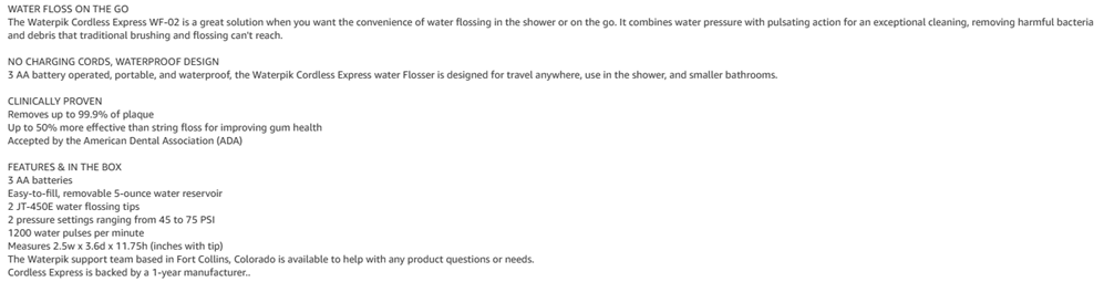 • BATTERY OPERATED HANDHELD WATER FLOSSER: The Waterpik Cordless Express Water Flosser is powered by 3 AA batteries and is designed for travel anywhere, use in the shower, and small bathrooms.