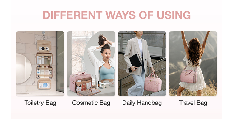 Special Design - 1 front zipper pocket for storing makeup brushes and cosmetics. Detachable shoulder strap provides a variety of ways to carry. Stow-away 360 degree swivel non-slip metal hook for versatile hanging options.