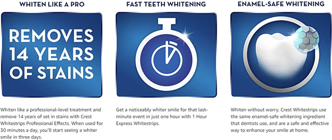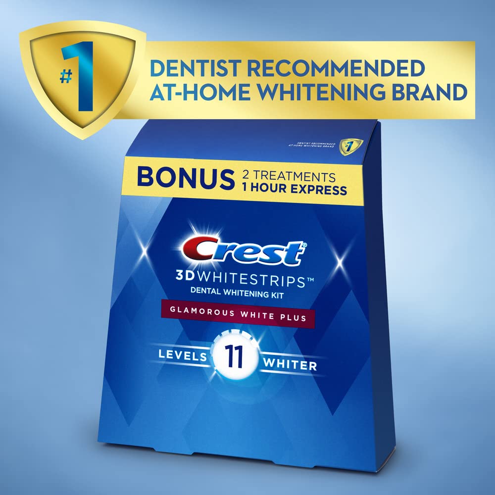 • Includes 14 glamorous white teeth whitening strip treatments, each with 1 upper and 1 lower strip, plus 2 bonus 1-hour express whitening strip treatments, each with 1 upper and 1 lower strip