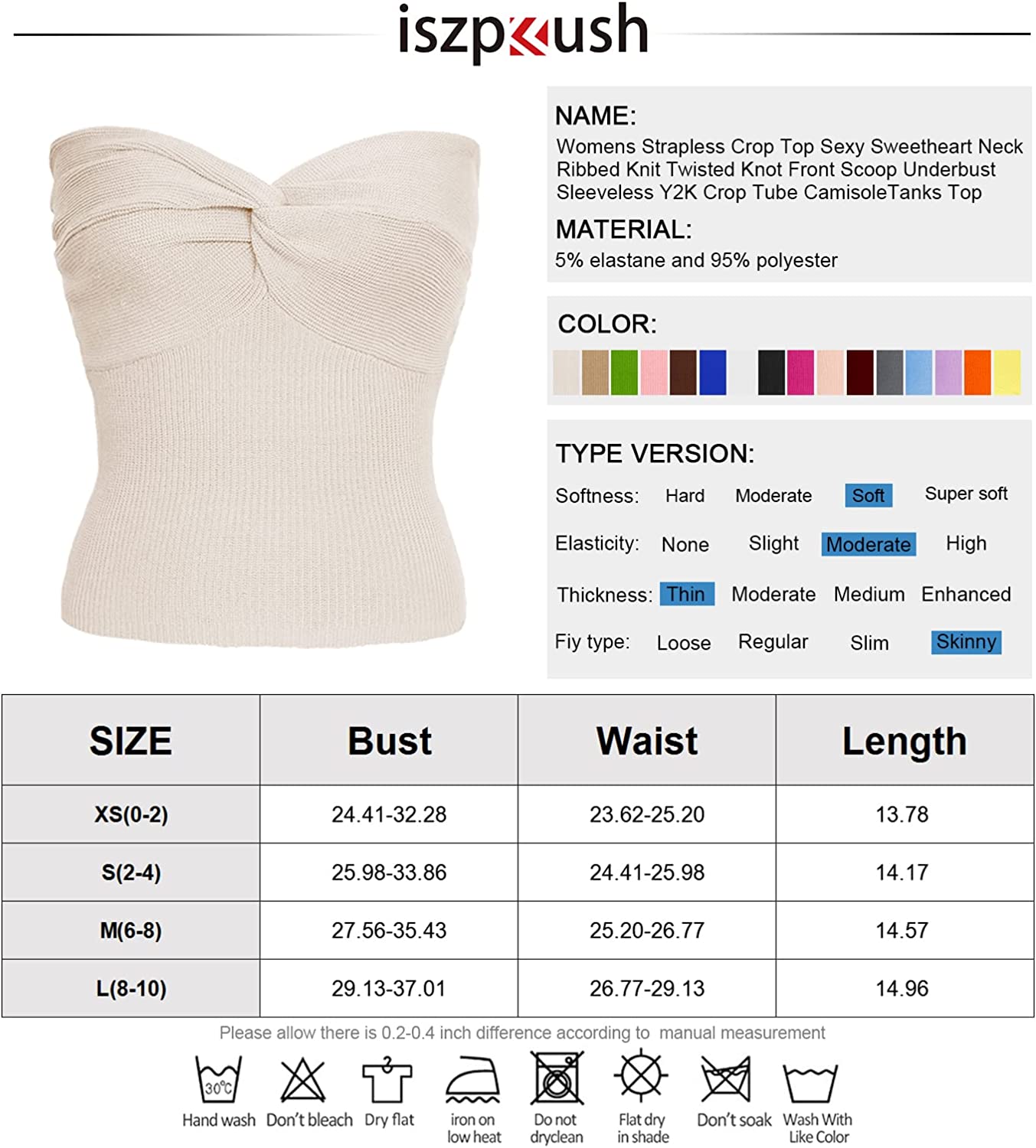 • Womens Crop Camis Feature: Strapless, Sleevess, Twisted Knot Front,Ribbed Knit,Sweetheart Neckline,Scoop Underbust, Keep you trendy, flattering and eye-catching at any time and anywhere.