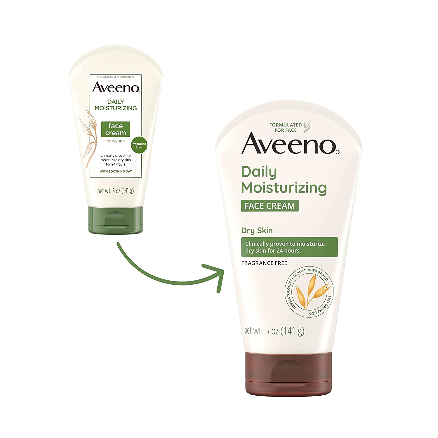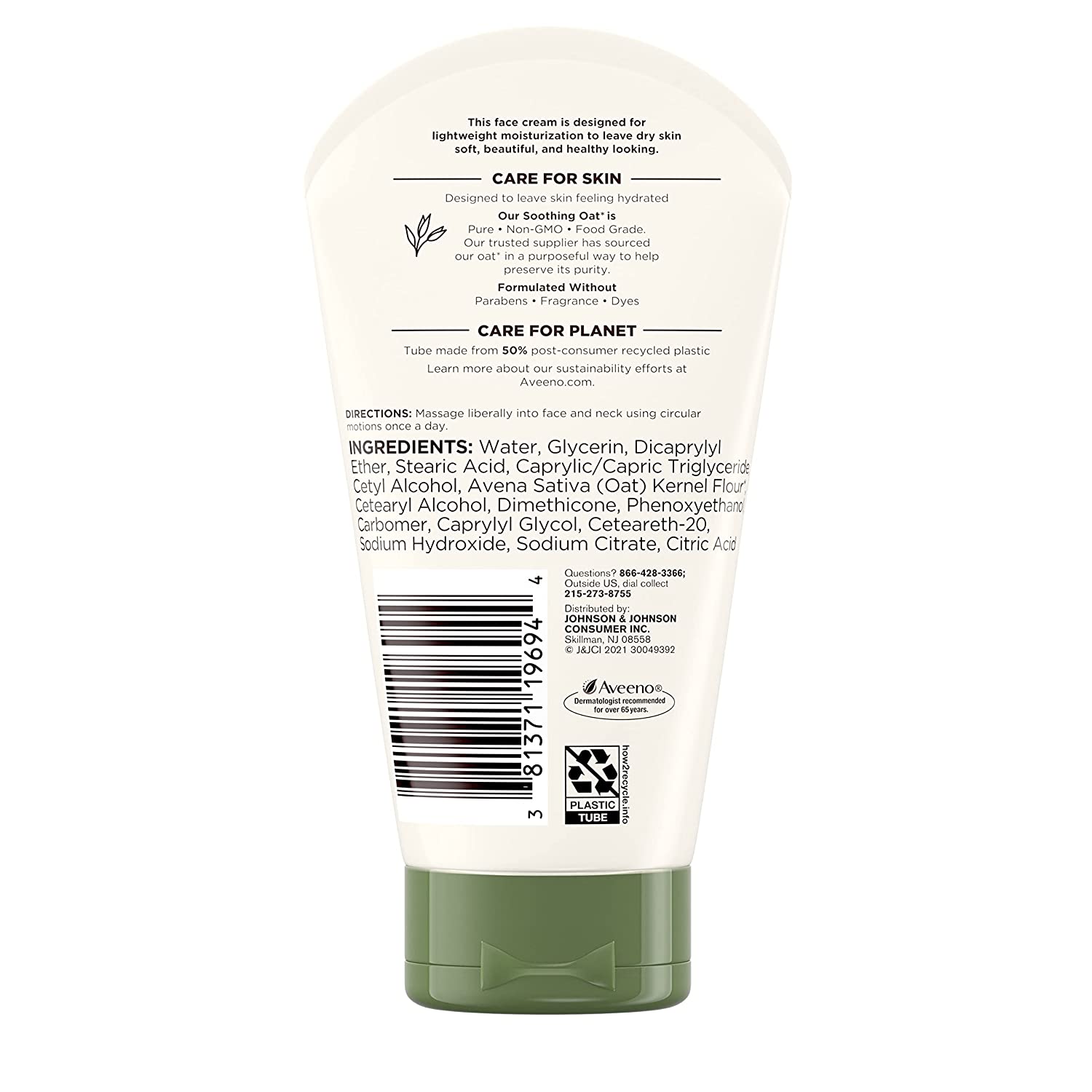 • From a dermatologist-recommended brand, Aveeno Daily Moisturizing Cream with Prebiotic Oat is packaged in a tube made with at least 40% Post-Consumer recycled plastic to care for the planet and is specially formulated for the face