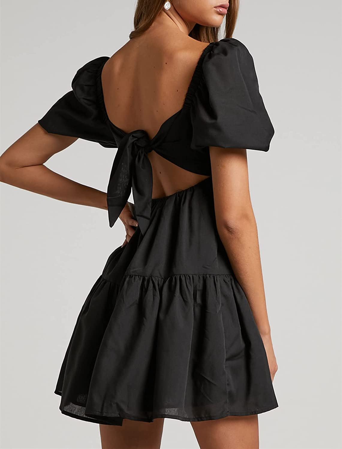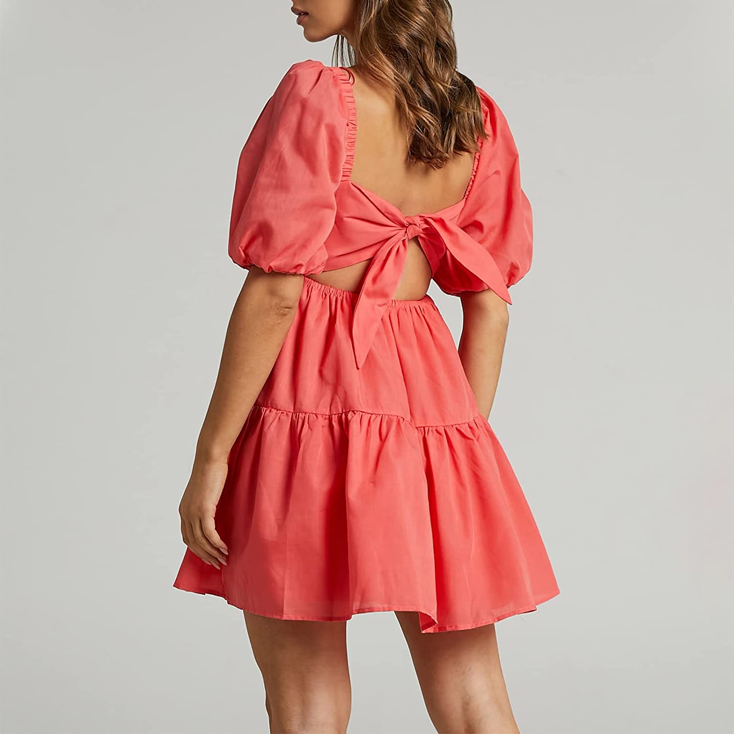 • DESIGNS: Tie Back, Open Back, Solid Color Short Sleeve Dress For Women, Square Neck, 1/3 Lantern Sleeve, Ruffle Hemline, High Waist Design, Mini Dress Style, A-line Design, Above Knee Length, Swing And Elegant Party Dress, Casual Dress, making the waist dress versatile and charming.