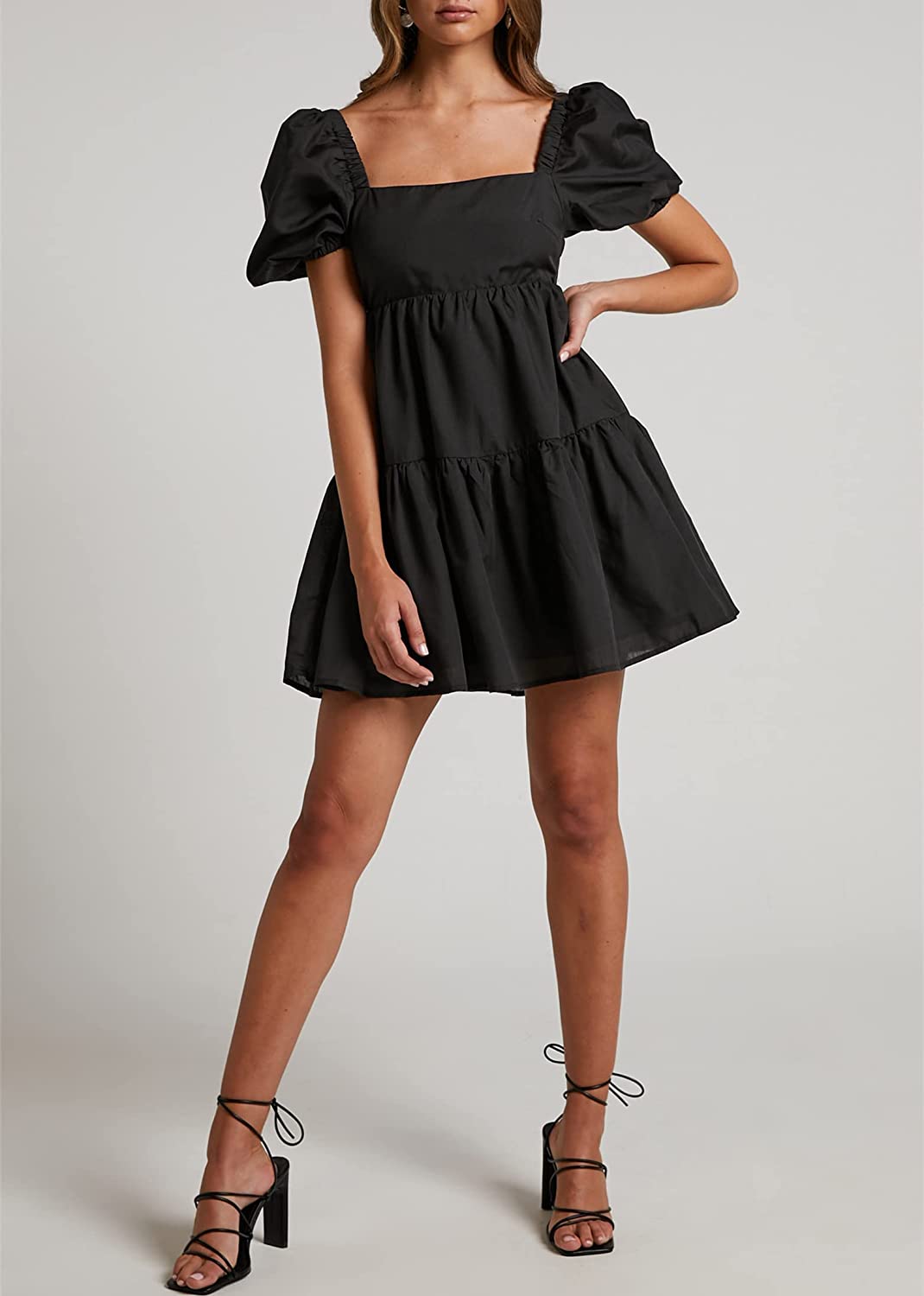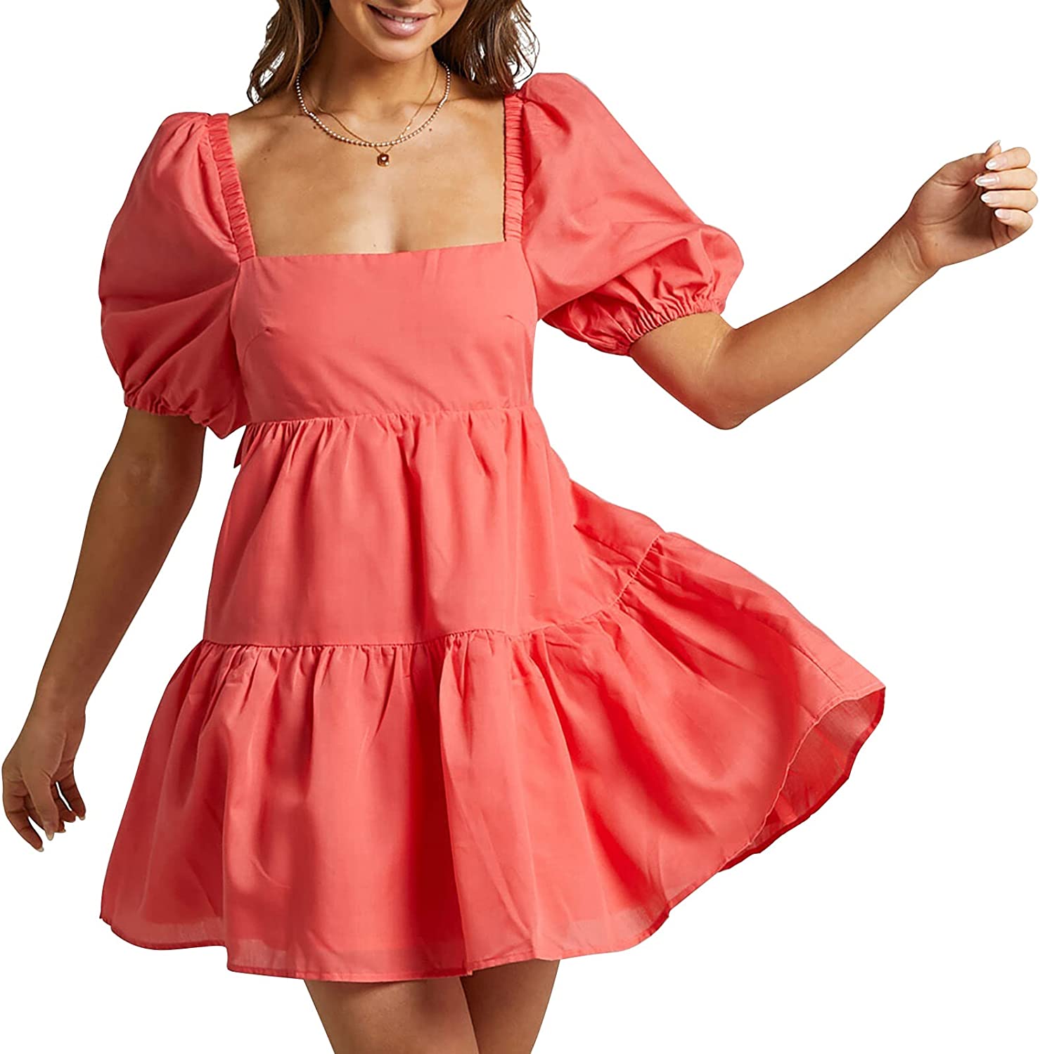 OWNGIGI Womens Square Neck Lantern Sleeve Dress High Waisted Tie Back Casual A-Line Mini Dress