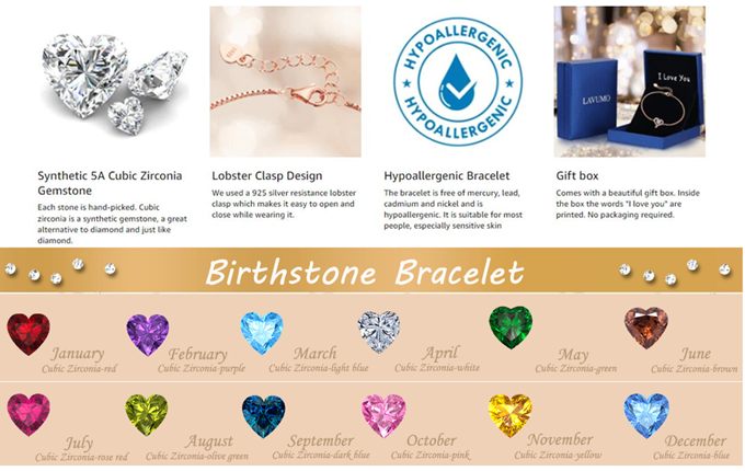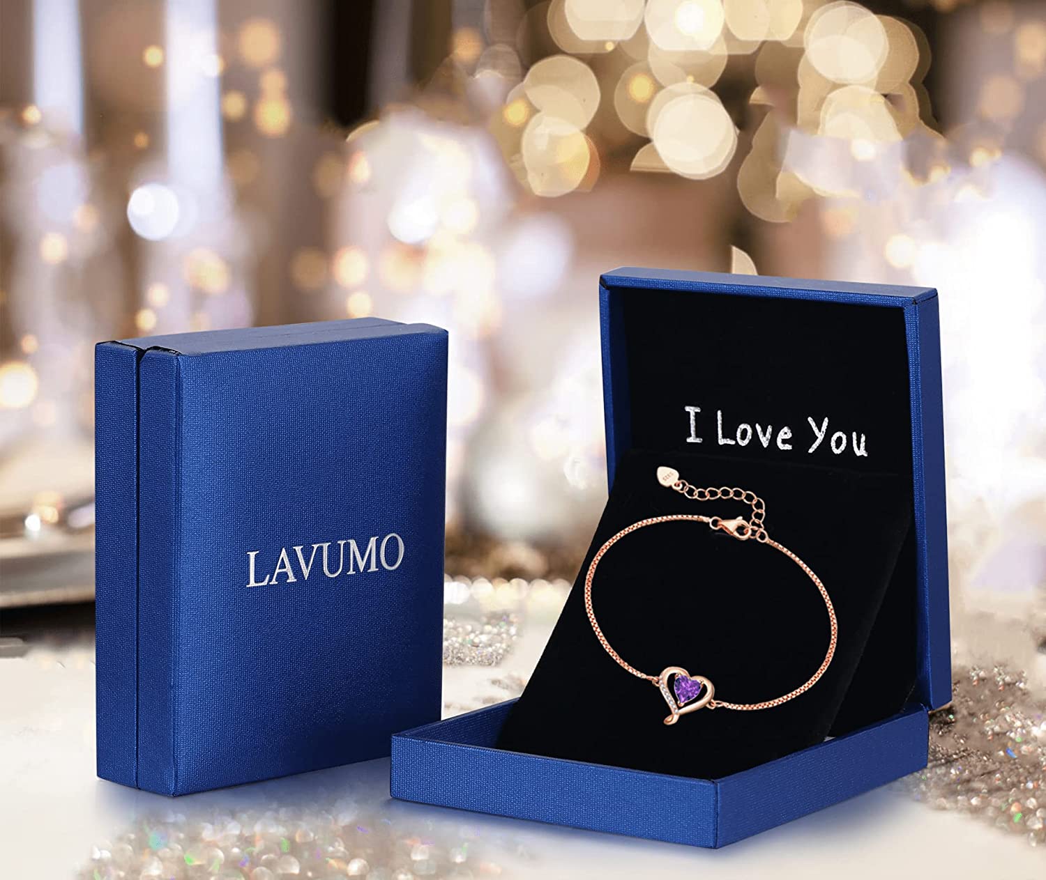 LAVUMO Heart Bracelet for Women 925 Sterling Silver Bracelet with Birthstone Zirconia,Adjustable Bracelet Best Mother's Day Gifts for Women Girls Chain Length 6.7"+1.6" Extend