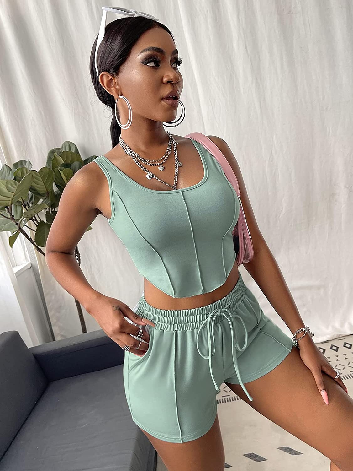 Feature: Drawstring, pocket, contrast binding, sleeveless, scoop neck, elastic waist, shorts set, fashionable
