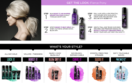 - Boost It Volume Inject Mousse infused with thickening agents, hair is boosted for a long lasting, bouncy and volumized look