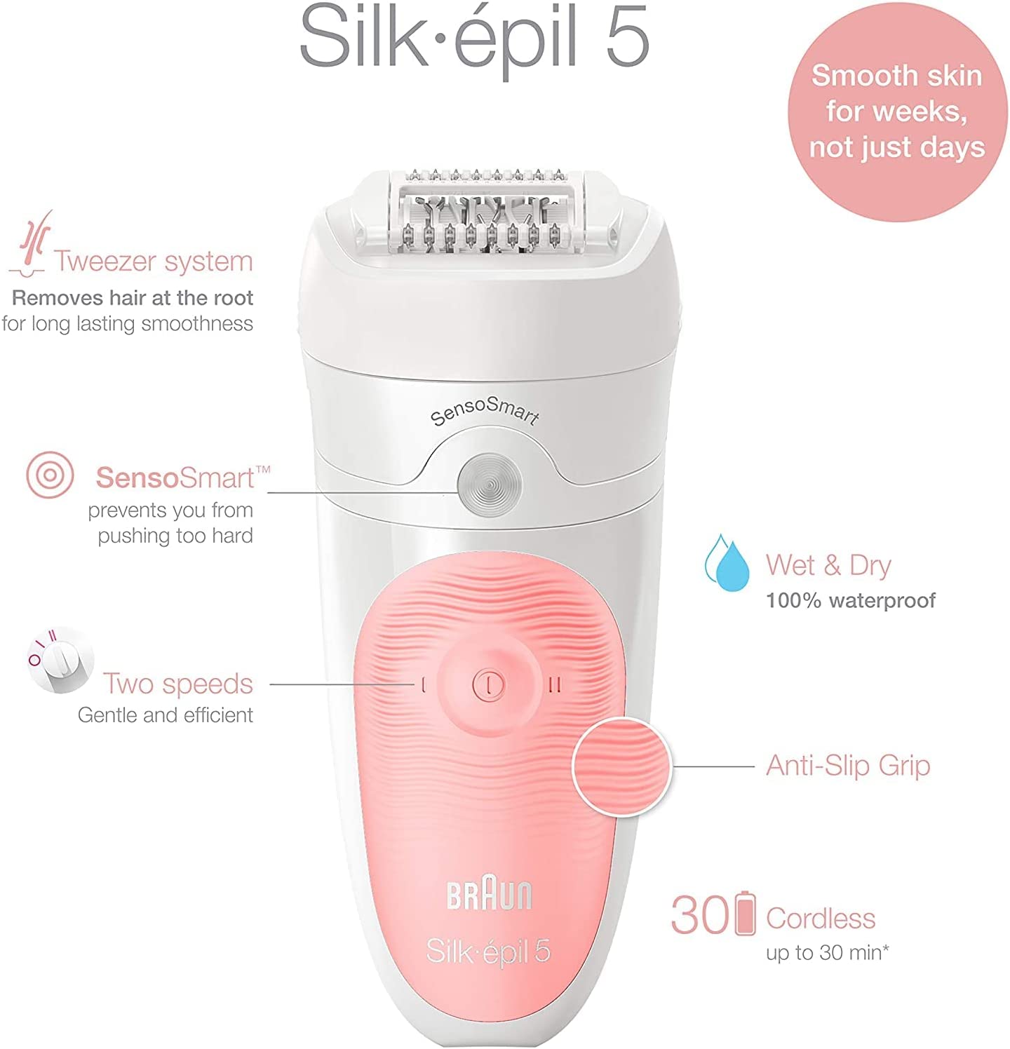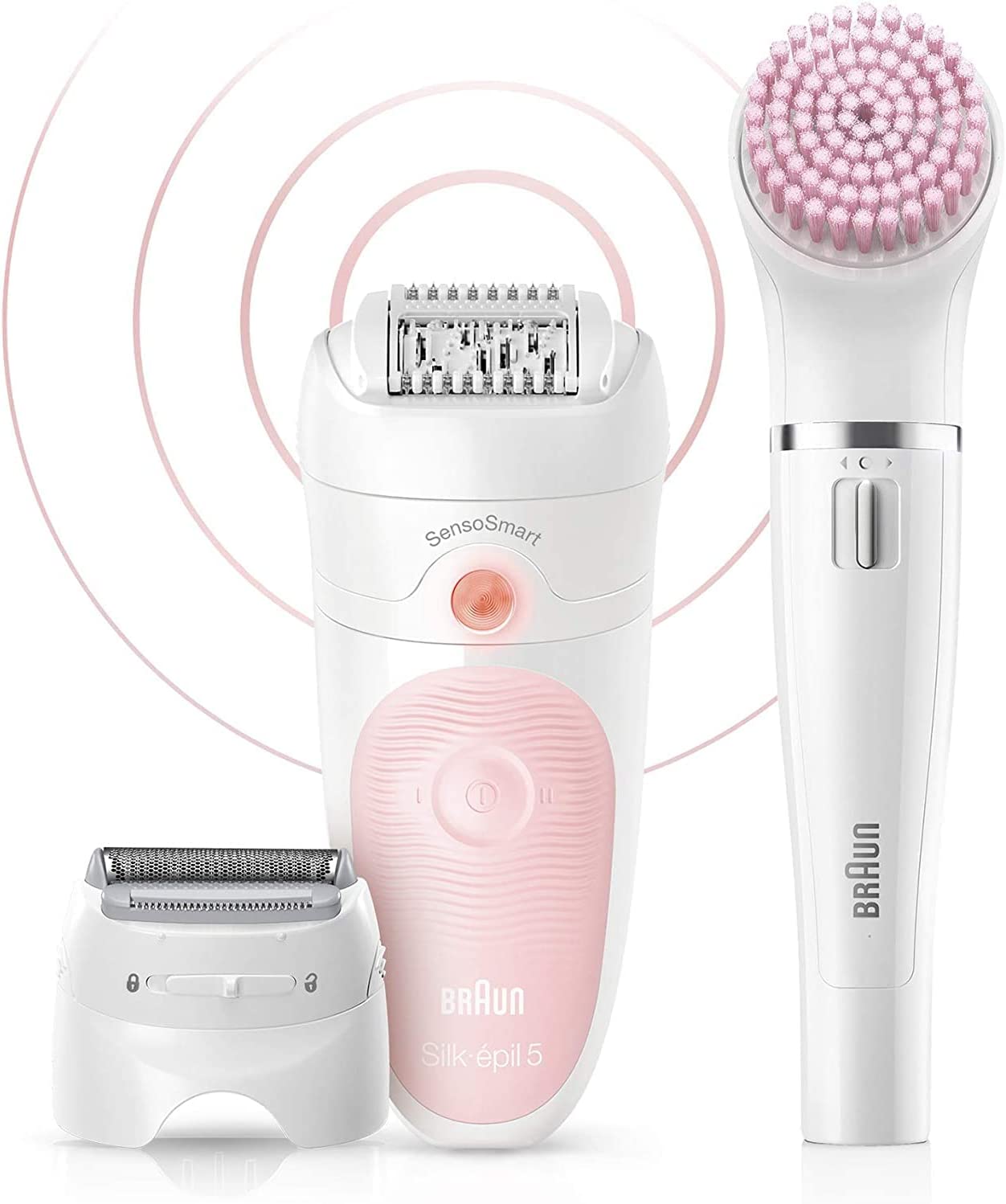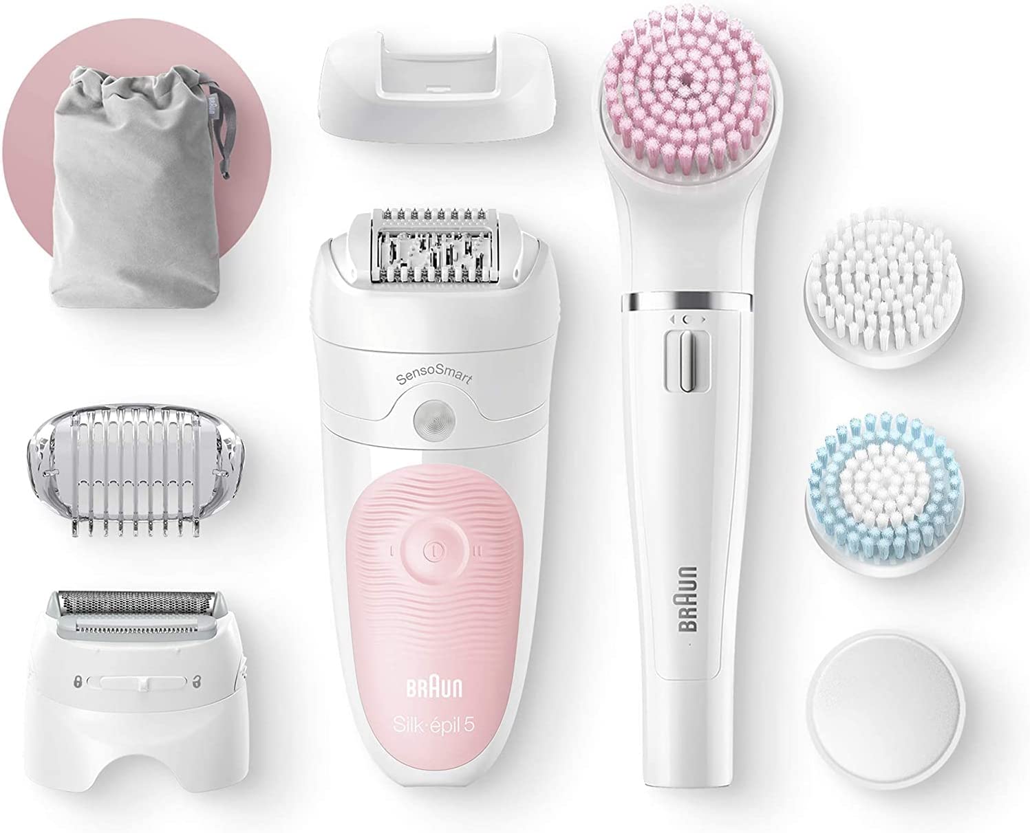 Braun Silk-épil Wet & Dry 5 5-895 Beauty Set, Women Epilator for Hair Removal, Attachments Made for Shaving, Peeling & Facial and Body Cleansing - White / Flamingo