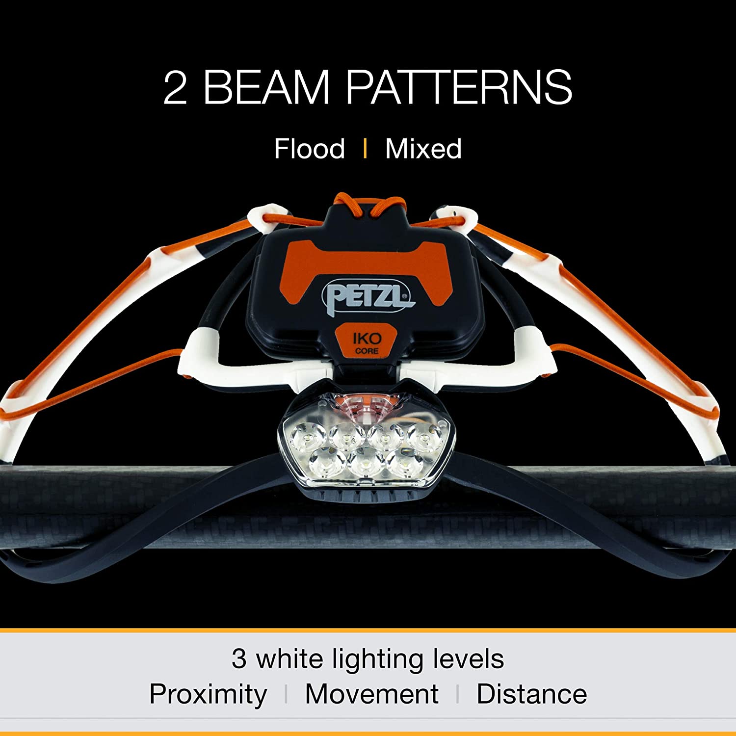 Impossibly light and extremely versatile, the IKO CORE is an innovative leap forward in headlamp design. Its patented AIRFIT headband is streamlined, flexible, water-resistant and almost imperceptible on the head. It easily adapts to a variety of uses, including a freestanding lantern, and collapses for compact storage. It’s also compatible with all Petzl helmets. The ultra-thin lamp body rotates 180 degrees, produces 500 lumens with 7 high-powered LEDs and provides clean, uniform light. The single, easily accessible button allows you to switch between 2 beam types and 3 lighting levels, delivering the right amount of light for any situation. Optimally balanced with a rear-mounted battery pack, the IKO CORE weighs only 79 grams. It comes with Petzl’s CORE rechargeable battery, is compatible with standard AAA batteries without an adapter and features a battery charge indicator. IKO CORE is finished off with reflective accents on the back and an IPX4 water-resistance rating, making it ideal for any outdoor activity.