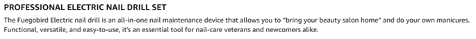 • Multifunctional & Portable Nail Drill Kit: Experience versatile nail care with this powerful electric nail drill kit. With Fuegobird electric nail drill, you can shape, buff, grind, polish, and remove acrylic, poly gel, artificial, thick, builder gel, dip powder, fake, and natural nails, as well as dead cuticles with ease. Suitable for manicure and pedicure beginners and pros.