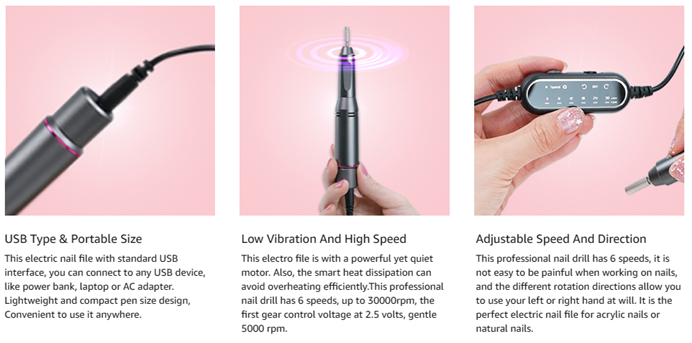 • Portable & Durable: Thanks to its compact and lightweight full-metal design. Fuegobird electric nail drill set is easy to carry with, allowing you to do nail art anytime, anywhere. You can power it with any USB socket, such as a power bank, laptop, or AC adapter.