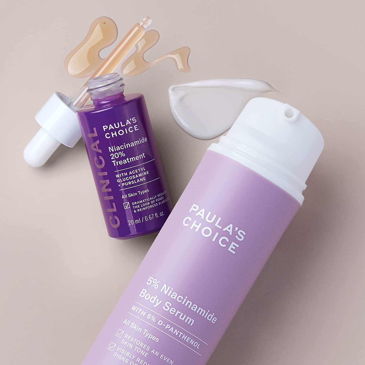 When it comes to targeting tricky body care concerns—think uneven tone or rough texture—a standard body lotion just won’t cut it. Enter the 5% Niacinamide Body Serum, a body treatment packed with niacinamide (vitamin B3), 5% d-panthenol (vitamin B5) and prickly pear extract. These bioavailable ingredients work uniquely within skin to help rebuild the delicate moisture barrier while actively fading stubborn marks, evening out tone and softening roughness. This ultra-light serum targets tricky small and widespread discolorations that happen on the body. Whether you’re dealing with dotted discoloration around pores, uneven skin tone from sun damage or stubborn marks left behind from breakouts—this can help. For application, apply a thin layer of 5% Niacinamide Body Serum, after cleansing and toning, to areas of concern from the neck down and follow with moisturizer if needed. For daytime, always finish with SPF 30+. The innovative CLINICAL 20% Niacinamide Treatment is the first ever to contain niacinamide at a safe, effective 20% concentration. This advanced level, complemented by purslane and acetyl glucosamine, steadily smooths out rough, orange-peel texture and tenacious bumps. Niacinamide (vitamin B3) is a smart, multifaceted ingredient that uniquely penetrates skin’s surface to help improve the look of sagging, stretched pores. It normalizes pore function and protects from further stretching when exposed to damaging UV light for a dramatically smoother, younger-looking complexion. For application, apply a few drops of Niacinamide 20% once or twice daily after cleansing, toning, and exfoliating. It can also be mixed in with the 5% Niacinamide Body Serum for an extra boost of benefits. At night, layer with other treatment products as needed and follow with moisturizer; during the day, finish with a sunscreen rated SPF 30 or greater.