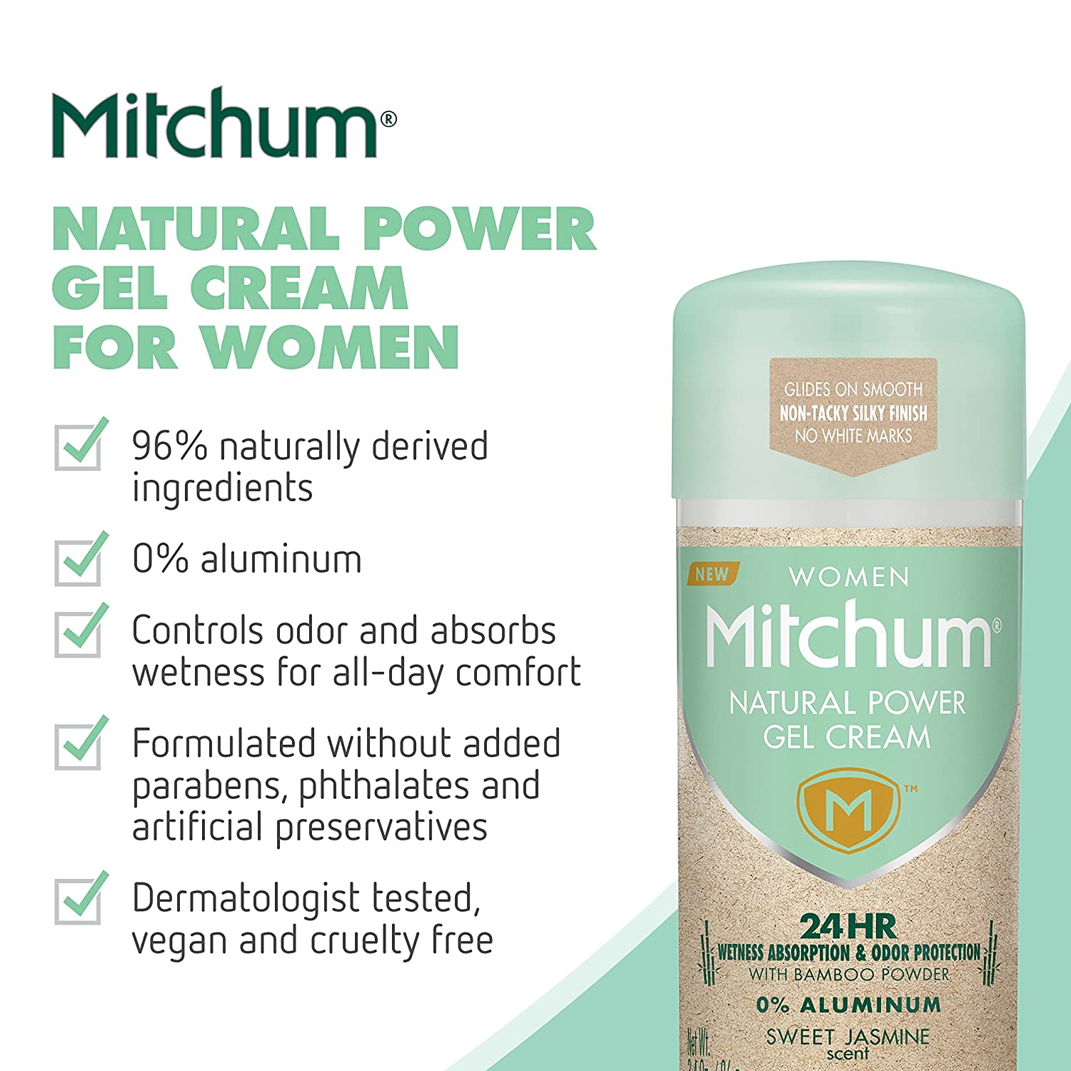 - NATURAL DEODORANT FOR WOMEN: Smooth-glide Mitchum Natural Power Gel Cream, made with 96% naturally derived ingredients and 0% aluminum, controls odor and absorbs wetness for all-day comfort without leaving behind white residue