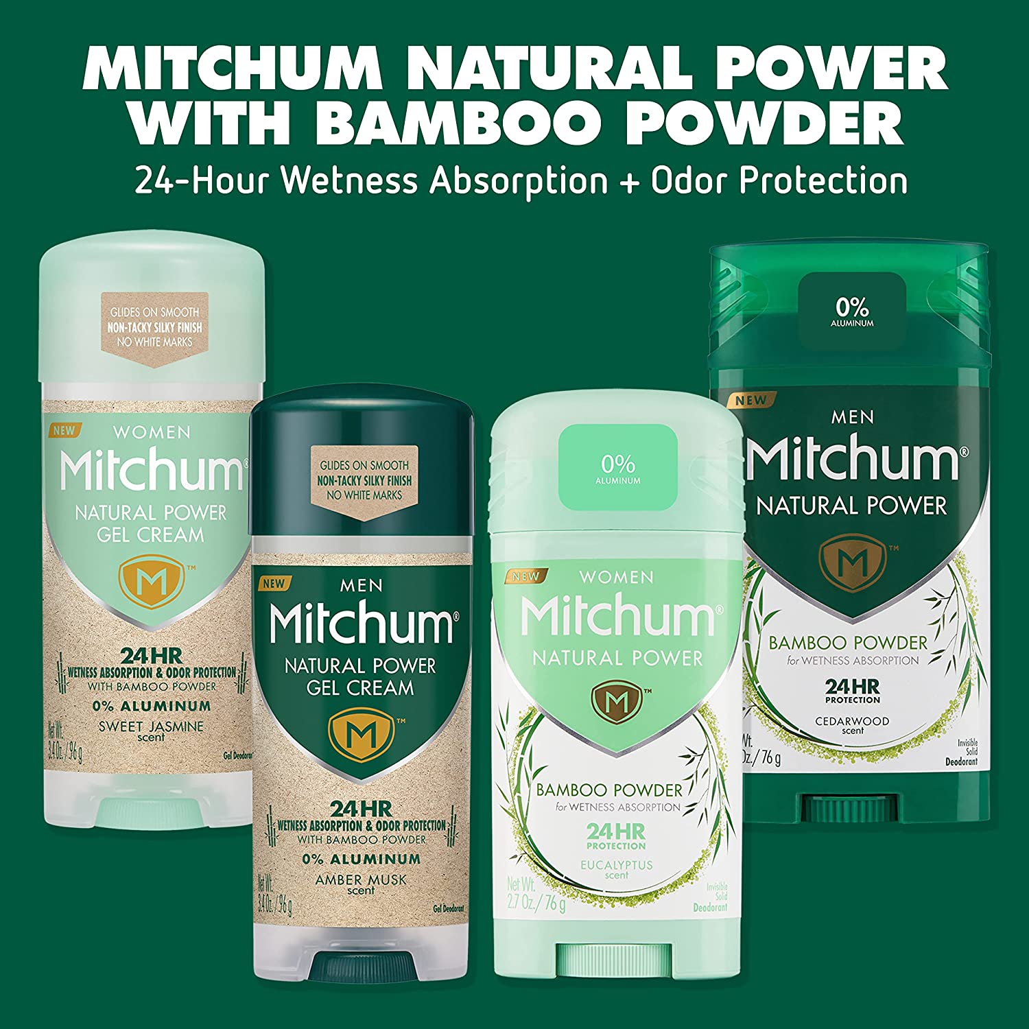 From Mitchum deodorant for women comes Mitchum Natural Power Gel Cream, an aluminum-free naturally derived odor neutralizer formulated with botanical oil extracts and powdered by bamboo power for wetness absorption. Enriched with skin-conditioning ingredients, the gentle, smooth-glide gel cream leaves skin feeling soft and moisturized—not sticky, greasy or irritated. Infused with a sweet jasmine fragrance, underarms stay dry and comfortable for 24 hours while smelling great. Formulated without added parabens, phthalates and artificial preservatives. Dermatologist tested. Vegan and cruelty free.
