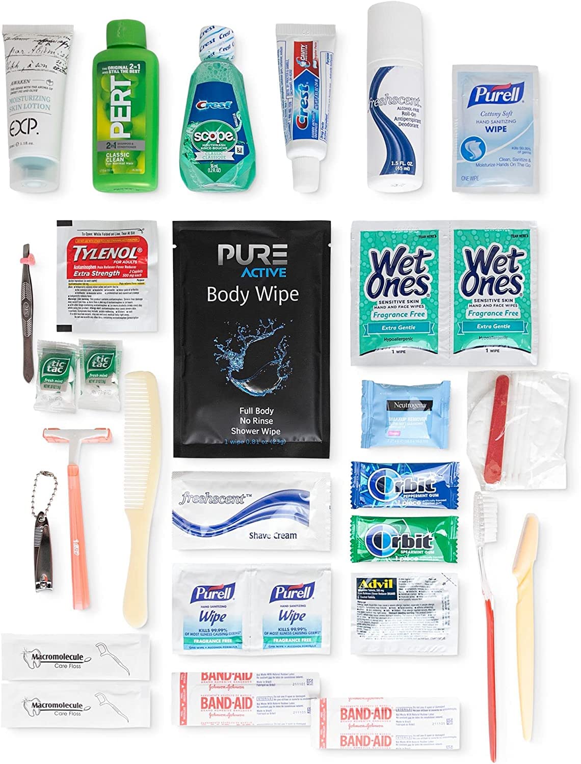• TOILETRY ESSENTIALS KITS - Toothpaste, Tooth brush, Mouth wash, Shampoo, Deodorant, Hand wipe, Hand cream, Tylnol, Advl, Cotton Pads, Cotton Swabs, Nail File, Nail clipper, Tweezers, Comb, Body wipes, Makeup remover, Shavers, Shaving cream, Mint, Gum, Dental floss, Bandages