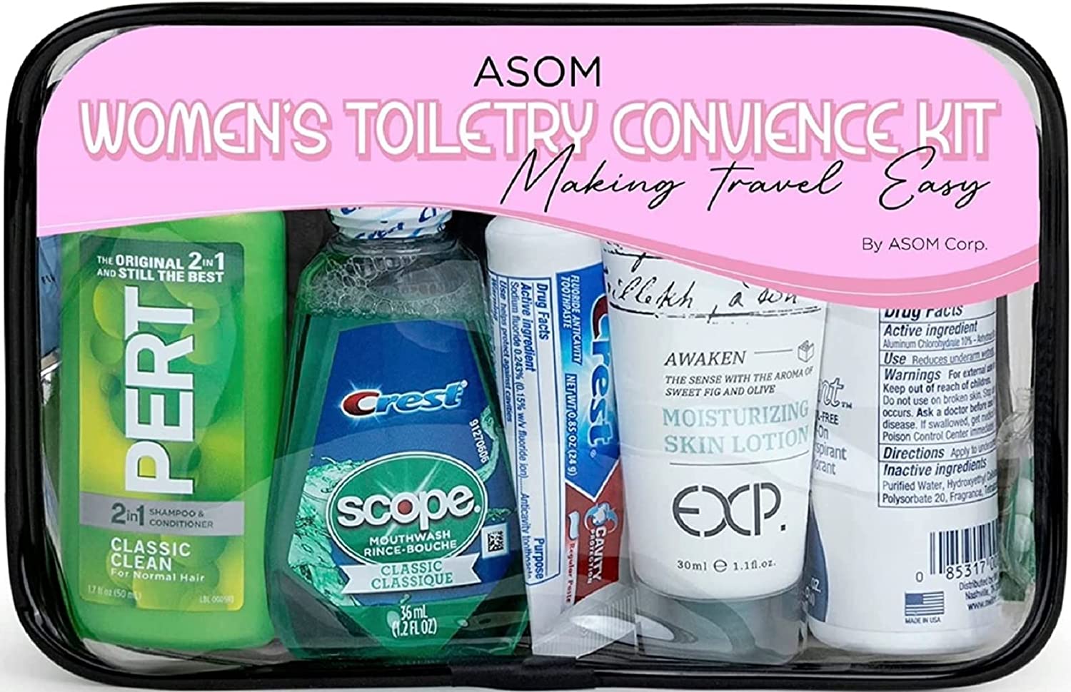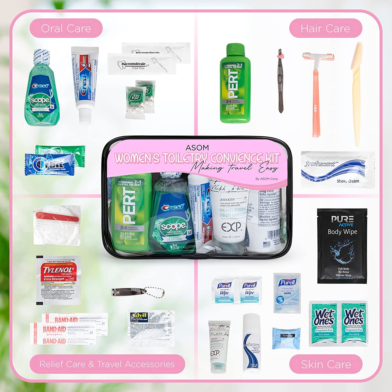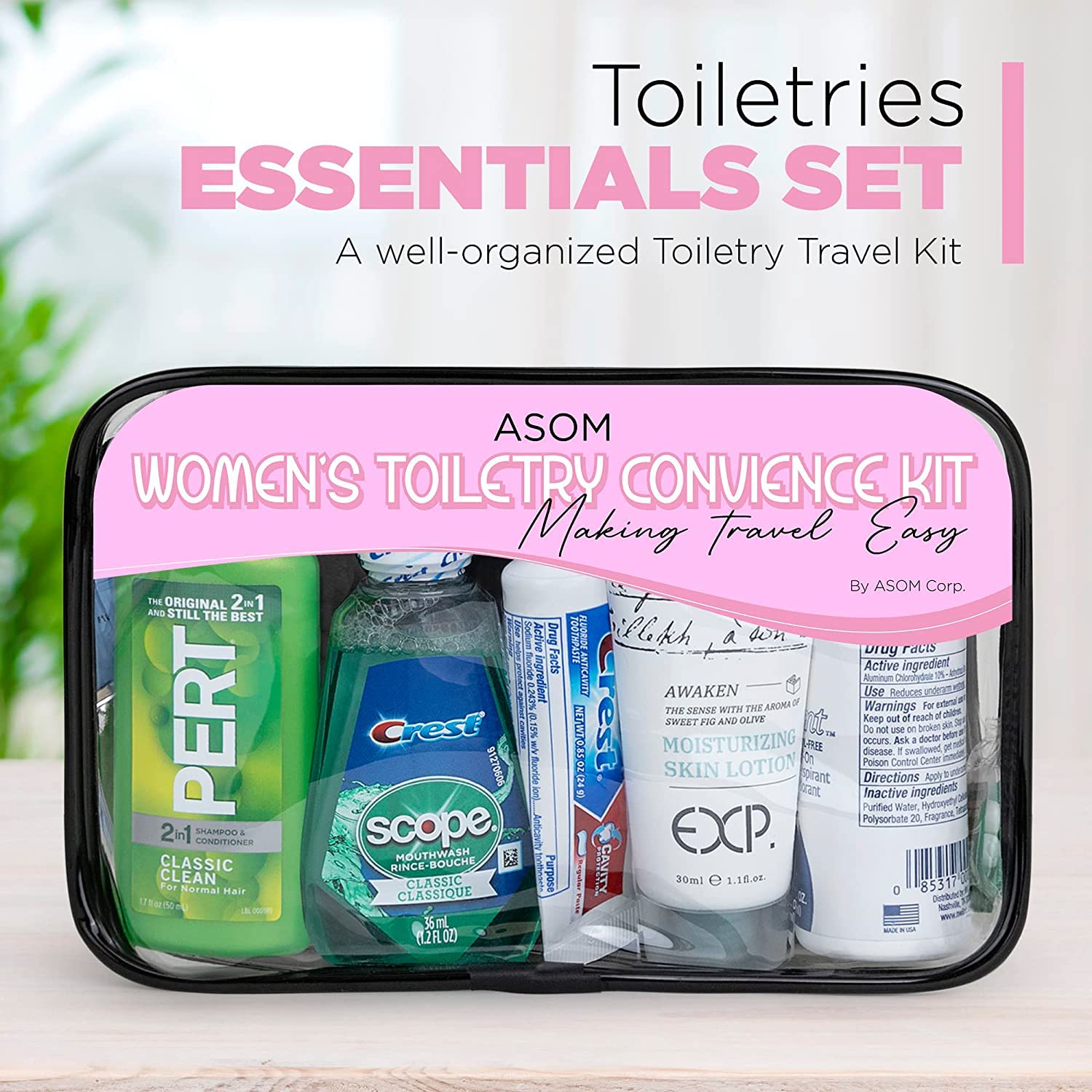 Asom Toiletry Travel Kit, Quality Hygiene Essentials Traveling Toiletries Prefilled Accessories Convenience Set, Tsa Approved Women Carry On Size Clear Toiletry Bag Accessory Kits.