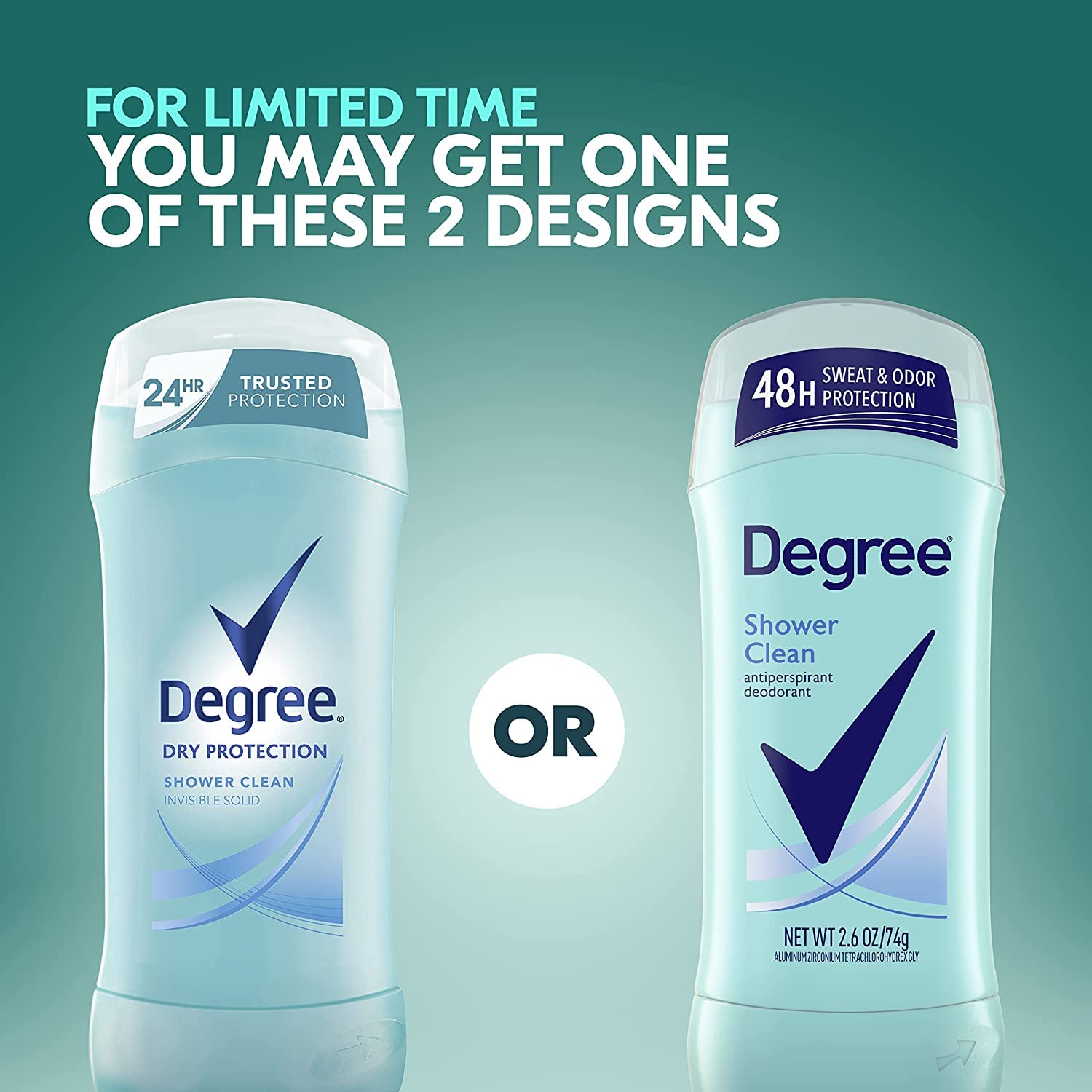 Degree is upgrading to our best formula yet. Our new and improved formulation gives you 72 hours of nonstop sweat and odor protection. You will still find all the same fragrances you know and love, but now with our new and improved long lasting protection! For a limited time, you may still receive our old 48-hour formulation while all our new 72-hour products make their way to a store near you. For the details of these changes, scroll down to see a full list of ingredients. Degree Advanced Shower Clean Antiperspirant Deodorant delivers nonstop protection, so you can face the day with confidence. This antiperspirant for women features 72-hour sweat and odor protection and the bright floral scent of rose and jasmine, blended with delicate fruit for an invigorating, clean feeling. Only Degree has MotionSense technology that moves in sync with your body. This antiperspirant deodorant spray releases a burst of subtle fragrance every time you move, for nonstop protection. Degree Advanced Shower Clean Antiperspirant Deodorant keeps you feeling fresher, drier, and more confident. This powerful antiperspirant deodorant responds when you need it most so that you don't have to worry about slowing down. Simply swipe and start moving.