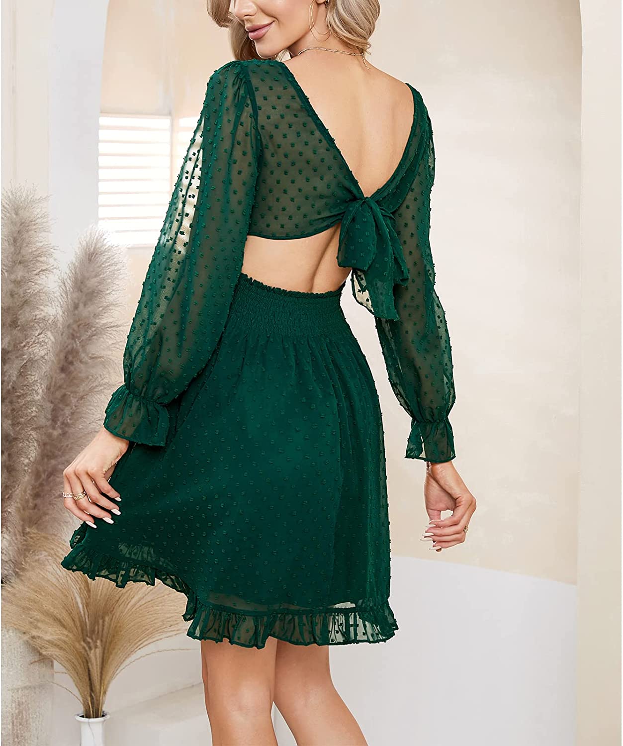 Design: v neck, puff long sleeve, ruffle cuff, drawstring, ruched front, cutout, smocked waistband, A line, frill hem, flowy swing dress, backless, tie back, Swiss dot, mini dress