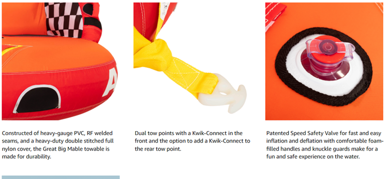 • 1-3 rider tube for boating and watersports.Unique Backrest/Front Riser ConstructionMultiple Grab Handles with Knuckle GuardsFront & Back Tow Points for different riding experiencesHeavy-Duty Full Nylon Cover with Zipper and EVA Foam Pads for a Comfortable Ride